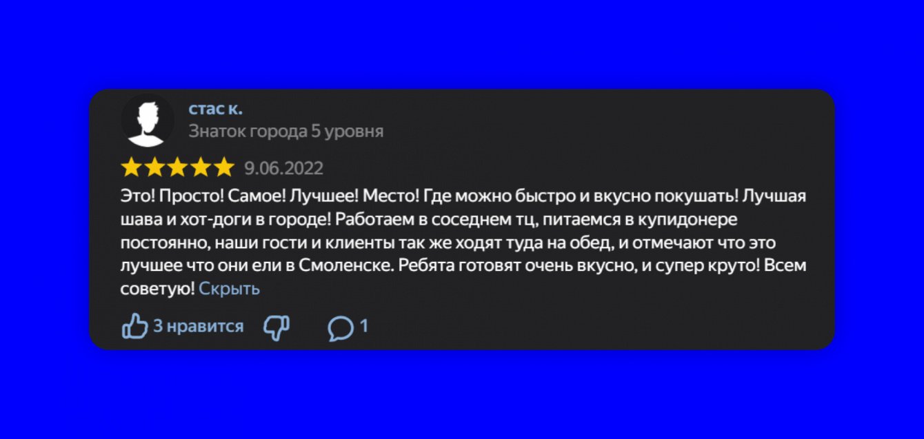 Изначально были сомнения: точно ли получу, что мне нужно? Сомнения отпали, когда я понял, как выстраивается процесс разработки. В итоге мы вместе превратили моё заведение в бренд, который знают и узнают в городе. Уже 4 года сотрудничаем, выросли вместе — сейчас у ребят команда специалистов, и я продолжаю обращаться к ним с разными задачками.