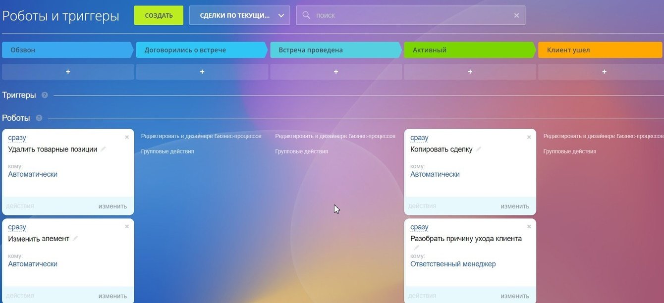 По текущим клиентам мы также настроили роботов так, чтобы после продажи сделка автоматически уходила в воронку повторных продаж. В случае же потери клиента также автоматически ставится задача с целью разобраться в причине ухода.