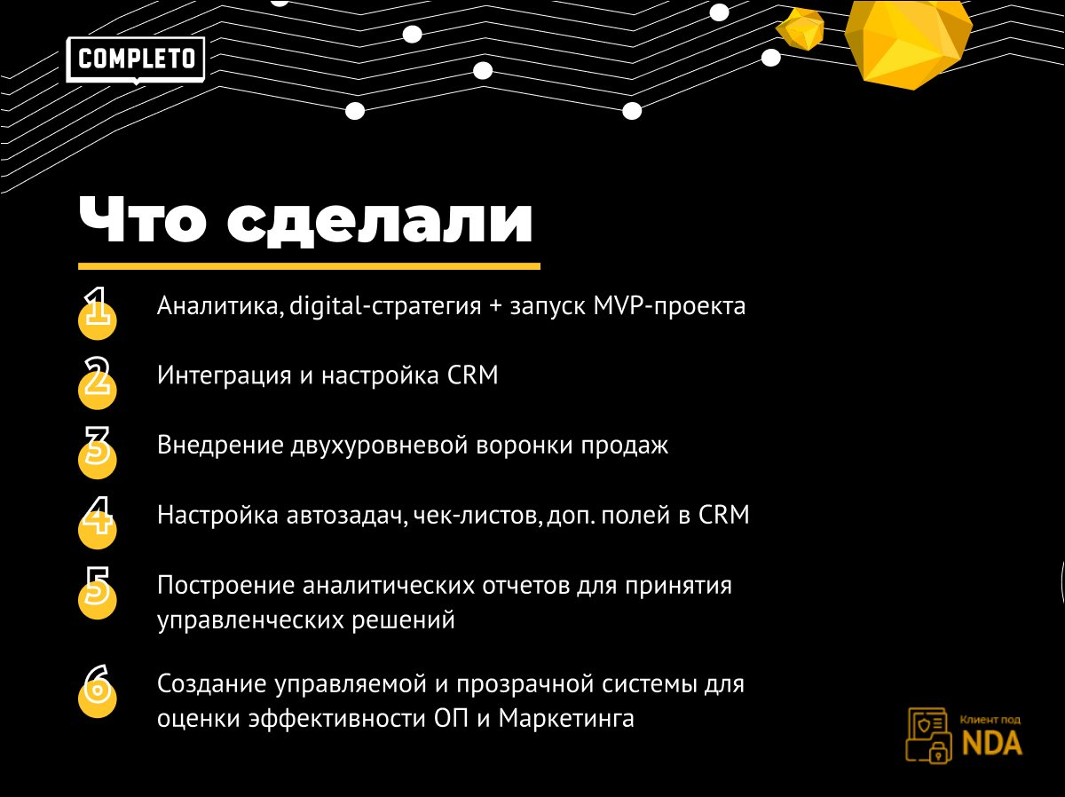 Так как для сотрудников компании процесс работы в CRM был новым, был настроен функционал постановки автозадач, к каждой из которых прикладывался чек-лист с указанием, что и как именно на данном этапе необходимо сделать.
