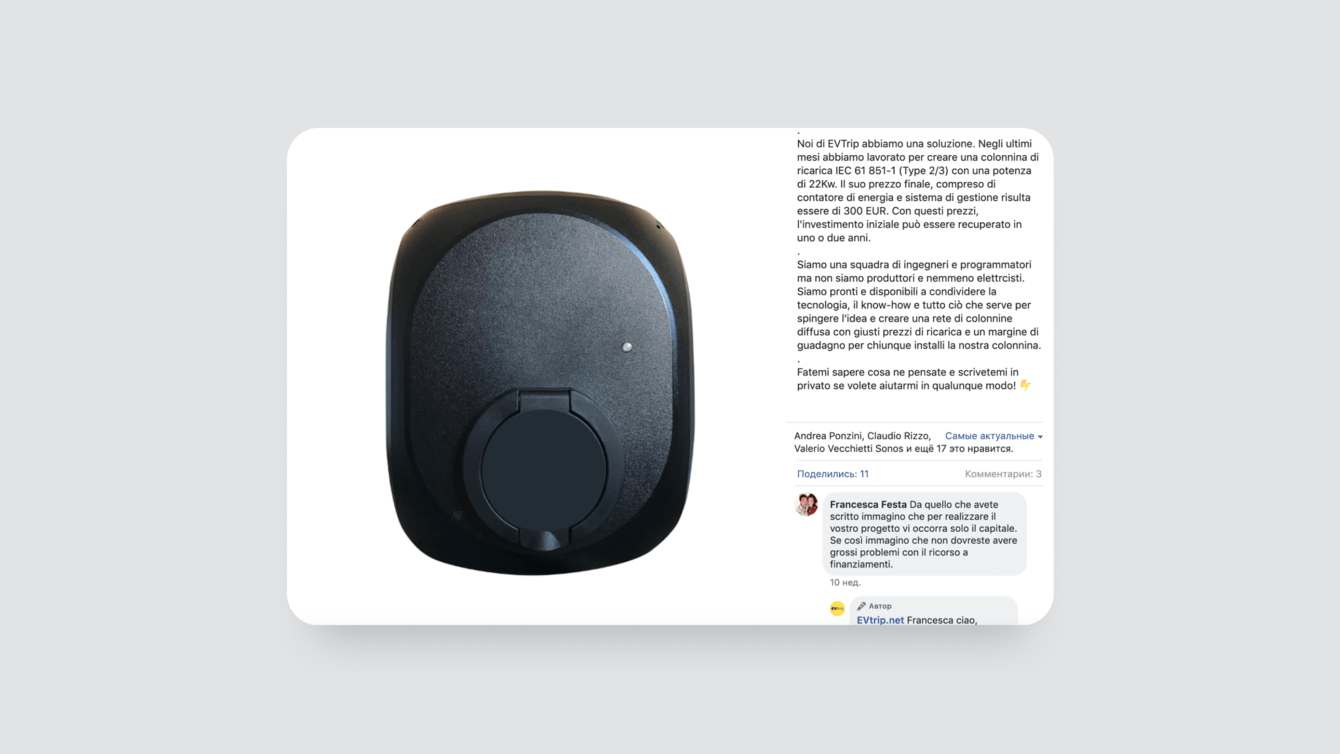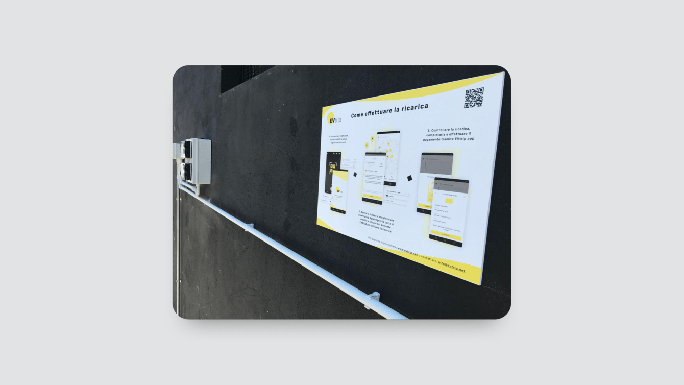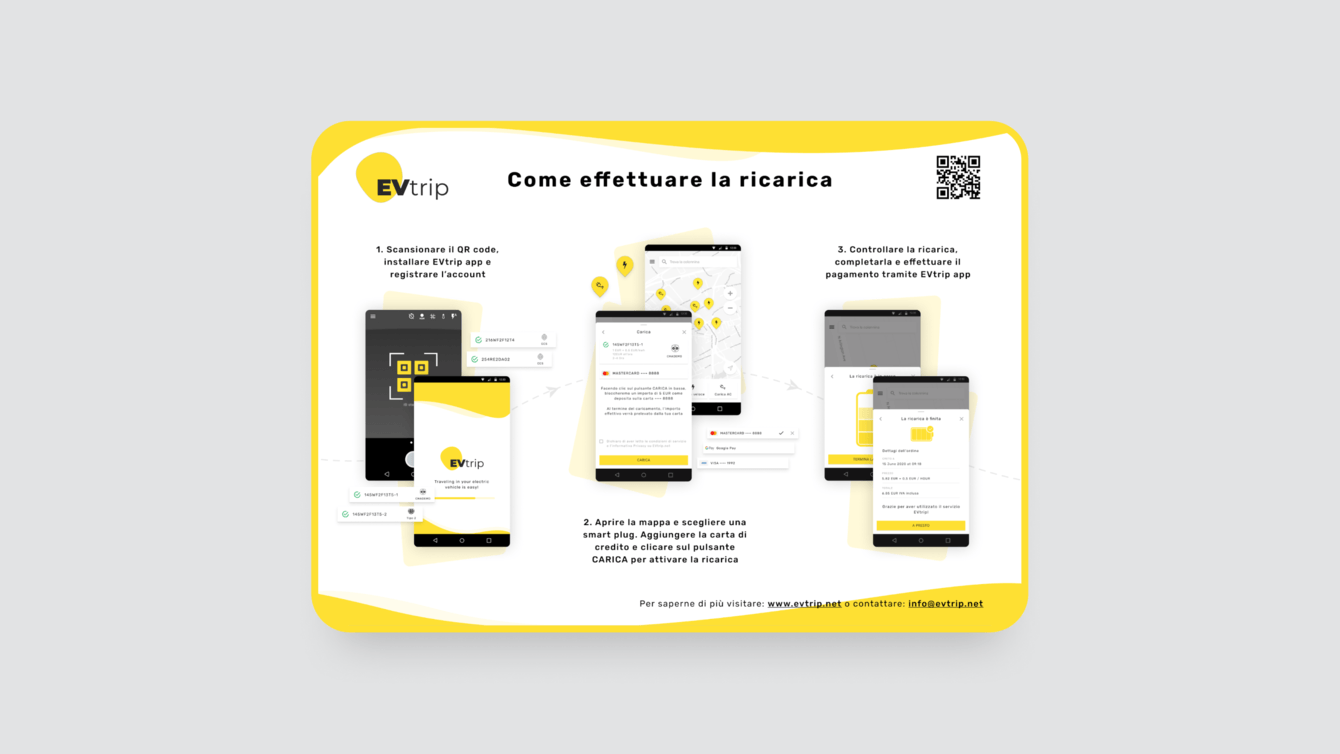Сегодня EvTrip успешно работает в Турине, Пинероло, Тоскане и других регионах Италии. Они развивают сеть зарядных станций с помощью партнеров и частного офлайн-бизнеса с парковками (кафе и рестораны, магазины и т.д.). Постепенно они охватывают все большую часть Италии и, вероятно, однажды зайдут в другие европейские страны. А вот и наш плакат!