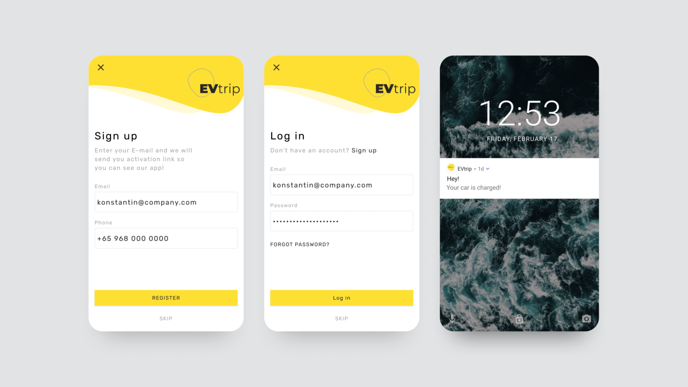 В этом плане у заказчика не было конкретных пожеланий, поэтому мы полагались на здравый смысл и собственный вкус: меняли яркость желтого, пробовали разные шрифты и размеры — результатом команда EvTrip осталась довольна. Заодно разработали для компании новый корпоративный стиль — необходимый шаг для поддержания UI консистентности.