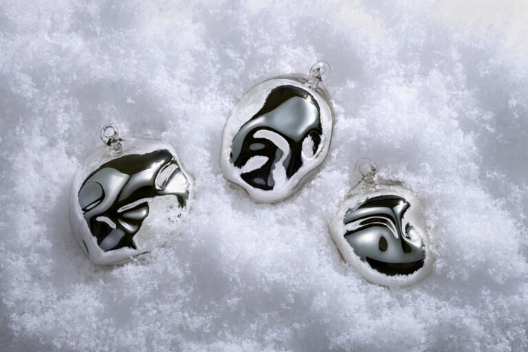 Ёлочные украшения коллекции «Эхо» — результат кропотливого ручного труда стеклодувной мастерской из Санкт-Петербурга. Стеклодув Егор Комаровских вручную придаёт каждой заготовке особую форму. В его работе нет места строгой геометрии — только чуткое следование материи. Такой подход делает каждую деталь непохожей на предыдущую форму, так же как неповторим каждый прожитый человеком год.