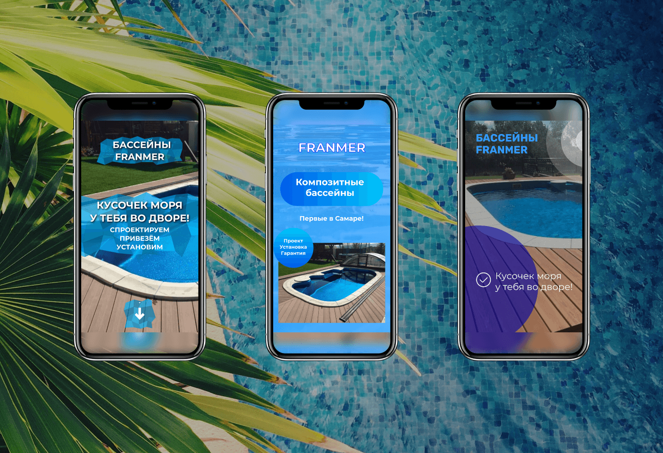 В качестве объявлений мы использовали анимированные изображения различных видов бассейнов, изготовленных компанией.