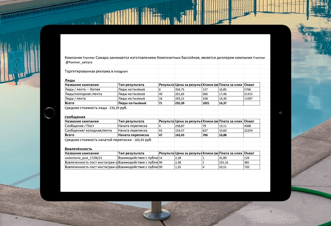 В качестве объявлений мы использовали анимированные изображения различных видов бассейнов, изготовленных компанией.