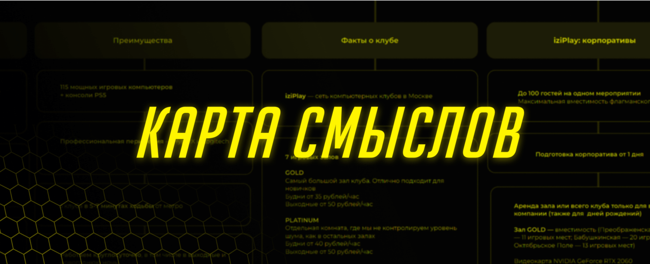 Чтобы избежать ошибок при этапе создания прототипа, мы составили карту смыслов, где структурировали полученную информацию — о конкурентах, клиентах, преимуществах и услугах клуба, и использовали ее при создании страниц.