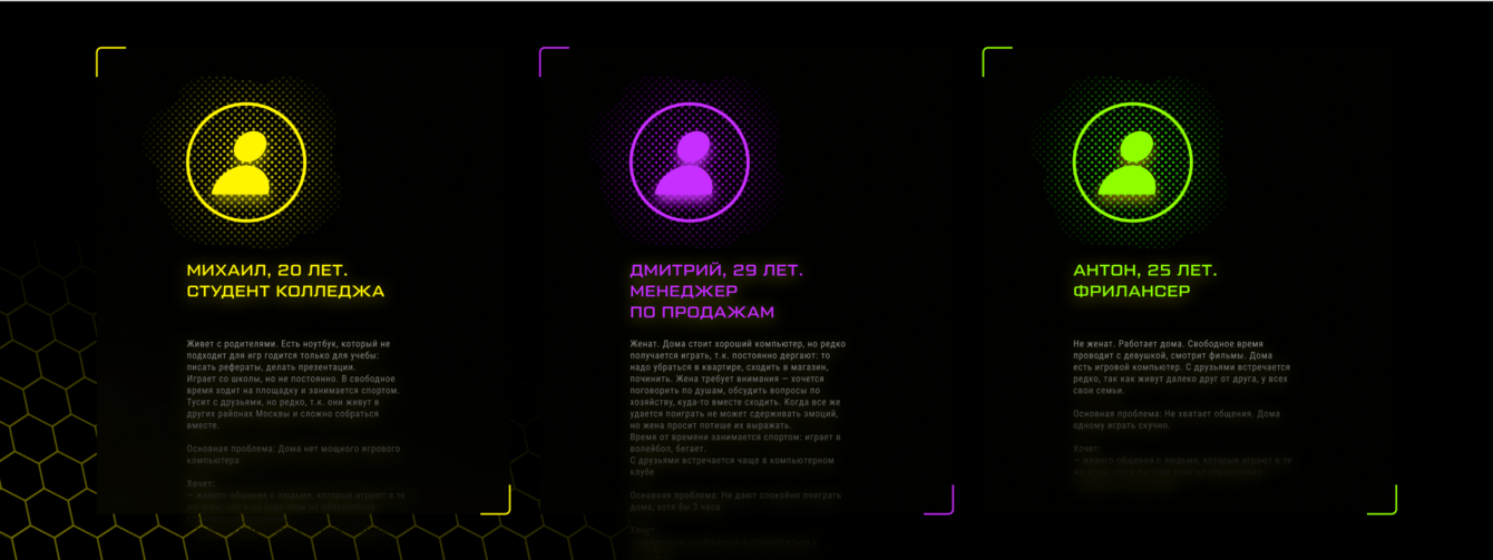 Основываясь на брифе, CustDev с игроками кибер-клуба и опросе аудитории iziPlay мы выделили 3 предпочтительных сегмента ЦА и прописали аватары. Это дало нам четкую картину болей, возражений, страхов и потребностей.