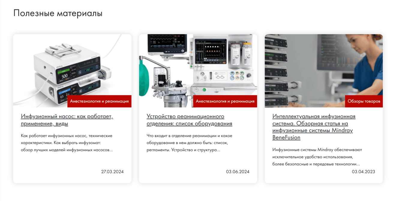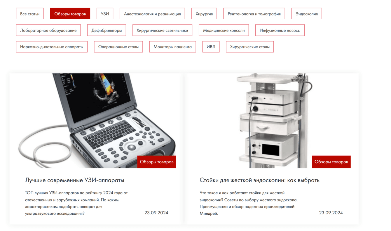 - Подборки оборудования для разных задач, например, кабинета УЗИ или реанимационного отделения. Из сборника читатель может перейти на раздел каталога с нужными товарами.