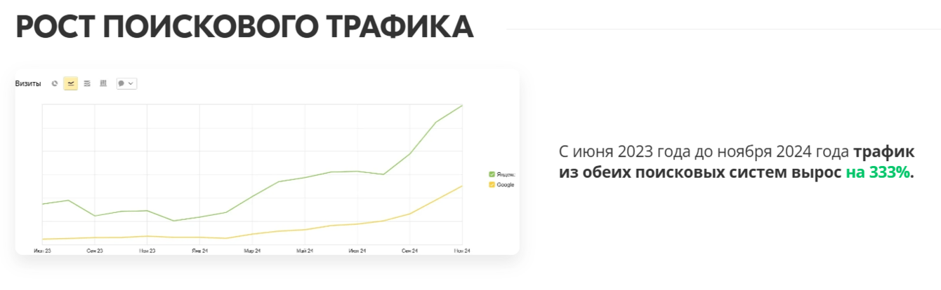 - Яндекс: рост позиций в топ-10: с 22% до 62%.