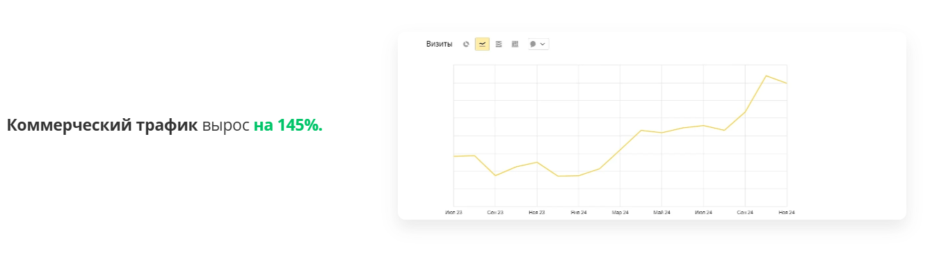 Мы начали со стандартной стратегии и проработки каталогов. Но в ходе работ изменили подход, подстраиваясь под маркетинговую стратегию клиента и его приоритеты. Несмотря на то, что пришлось отойти от классического SEO, удалось получить рост трафика и количества целевых лидов.