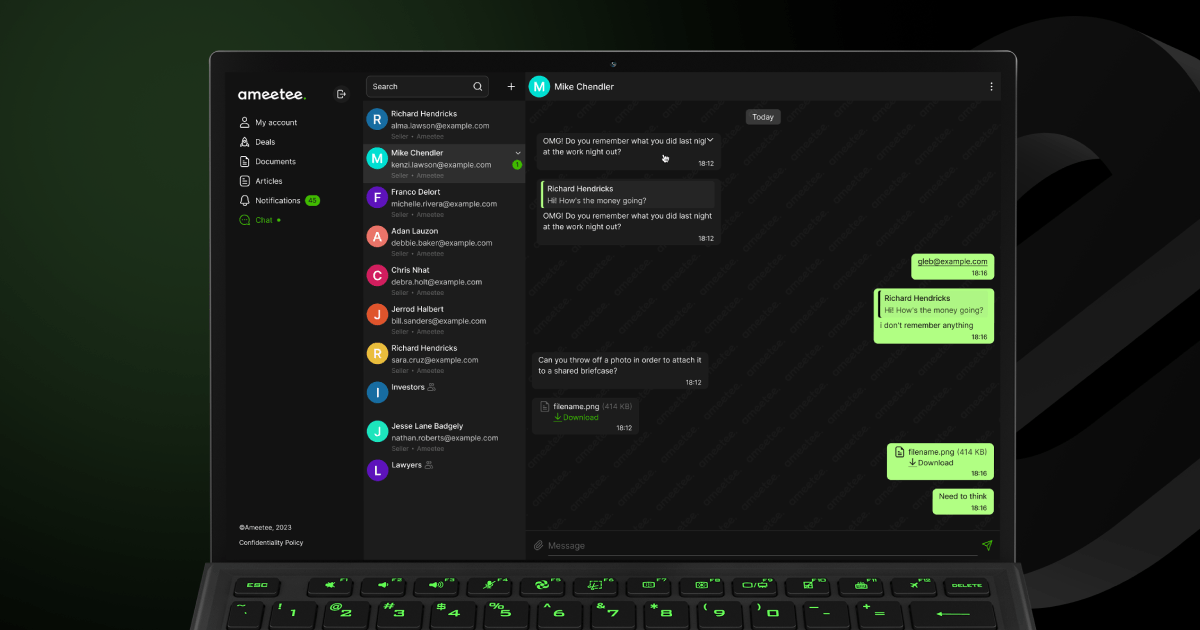 У сторон нет контактов друг друга. Между ними — команда Ameetee. Она проводит анализ стартапов, оценивает, проверяет все на юридическую и финансовую чистоту.