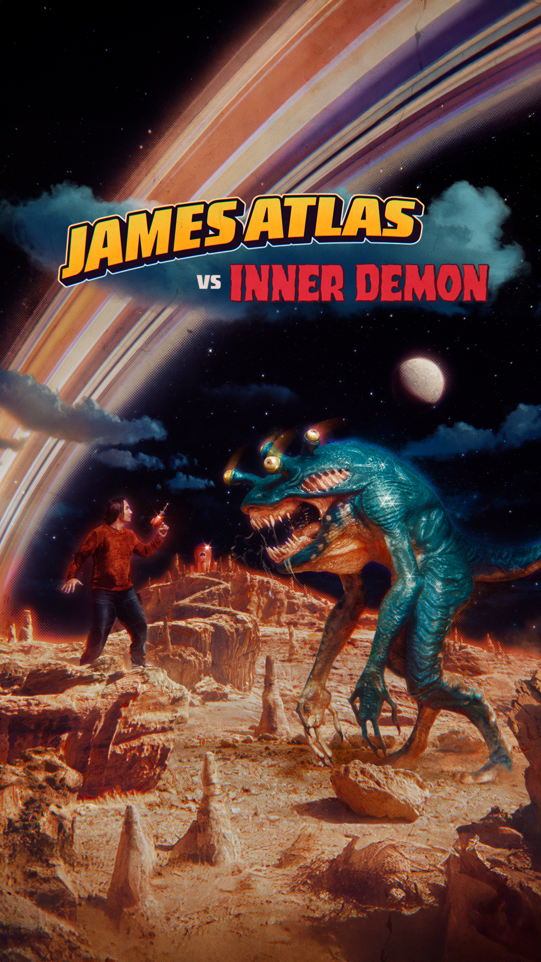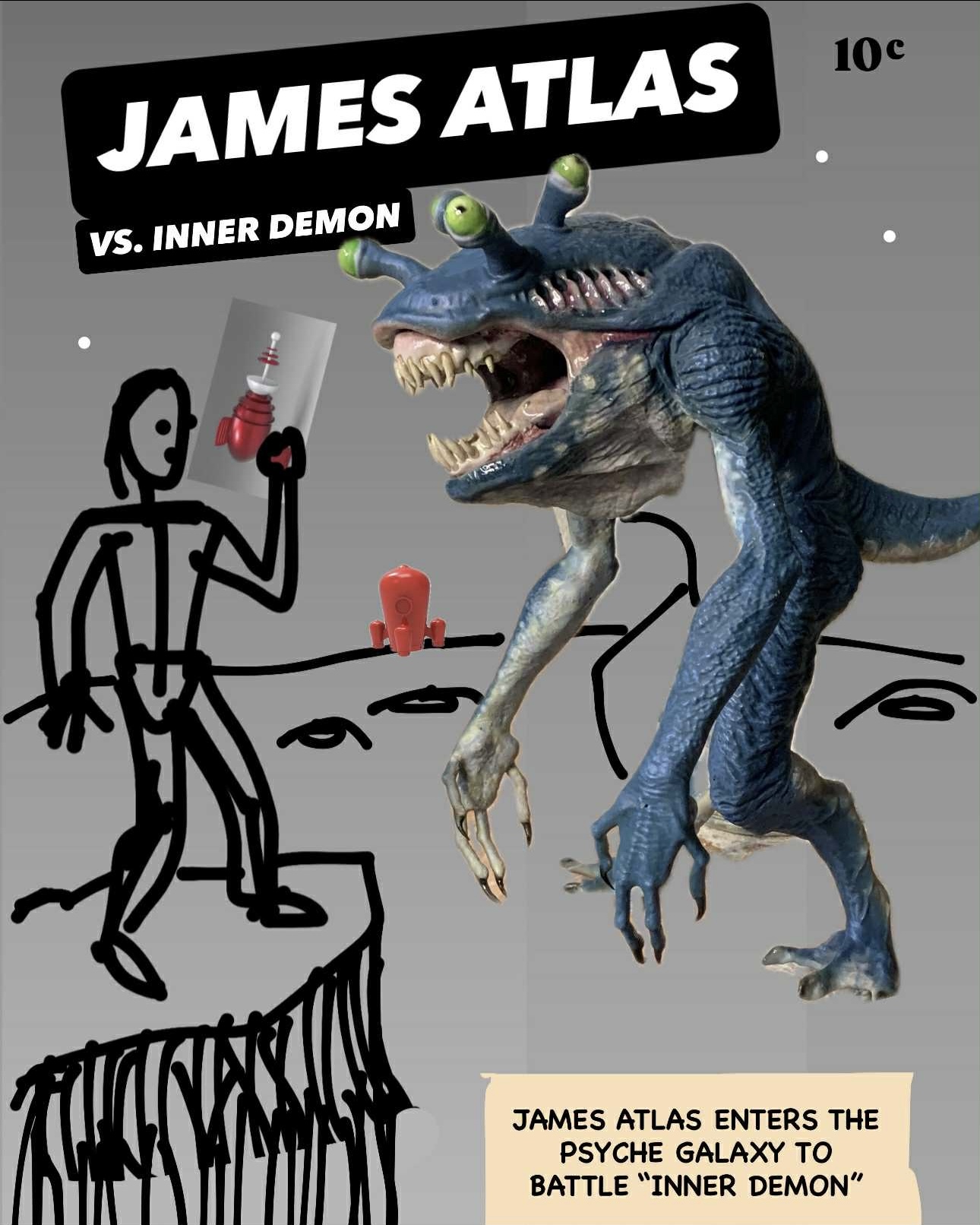 Создать ретро-футуристическую космическую битву между Джеймсом Атласом и визуальным воплощением внутреннего демона. Изображение должно выглядеть как обложка ретро-футуристического комикса.