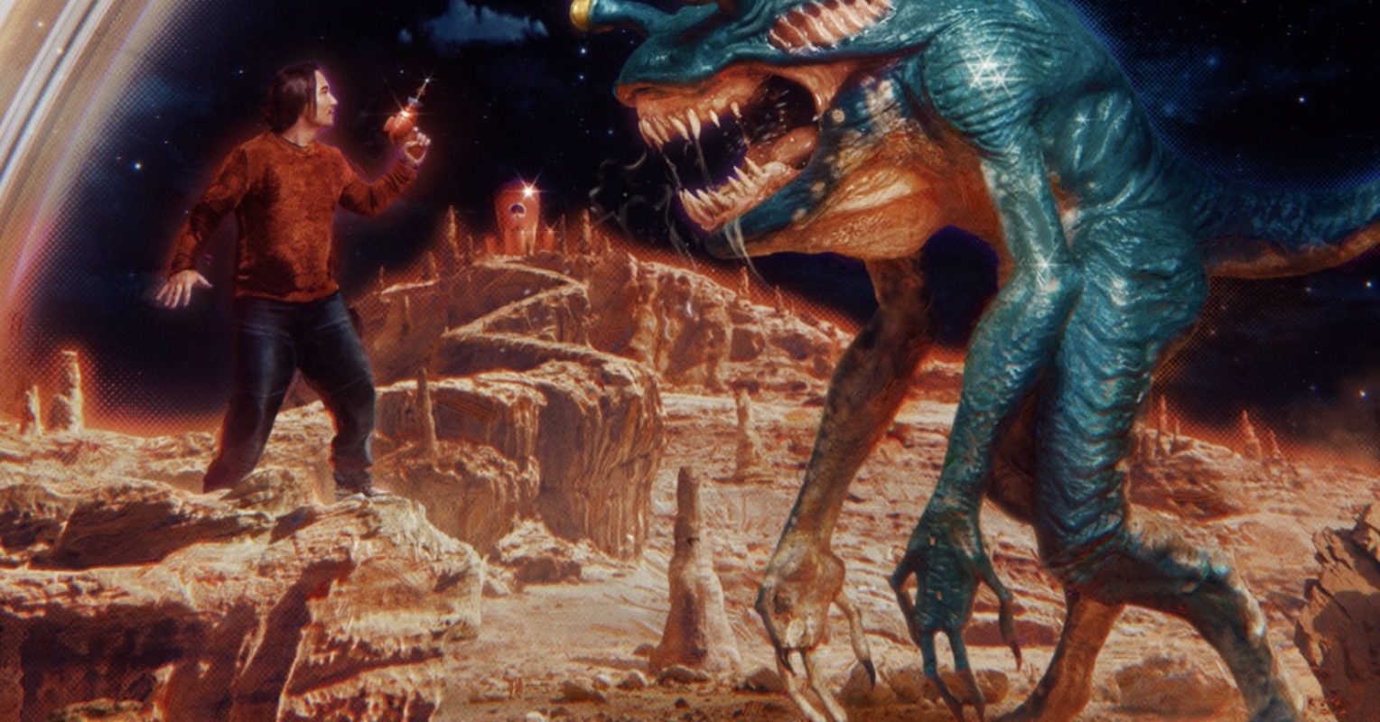 В результате получилось гиперреалистичное изображение с чрезвычайно детализированной проработкой: даже при сильном увеличении можно увидеть эффект полутонов и мельчайшие несовершенства кожи существа. Это интересная работа, потому что ретро-футуризм обычно предполагает более плоскую текстуру. Изображение получилось выразительно стилизованным благодаря формам скал и динамичной перспективе колец планеты. Я также продумал композицию — например, лёгкую атмосферную перспективу для глубины и круговое движение взгляда по изображению.