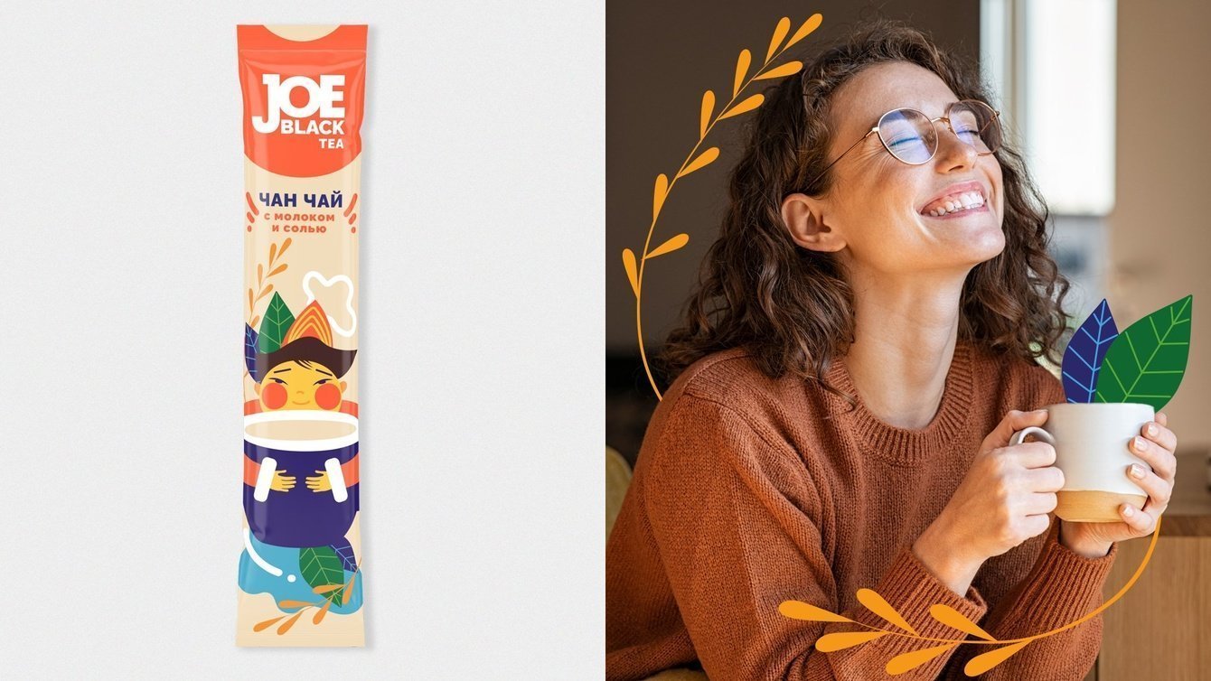 Джо Блэк — парень со светлой душой, который рад друзьям в своем кофейном мире. Собственно, его имя указано в логотипе. За счет своей характерности логотип привлекает внимание, при этом не отвлекая от сюжета на упаковке. Кроме того, логотип становится константой, которая уверенно держит всю линейку.