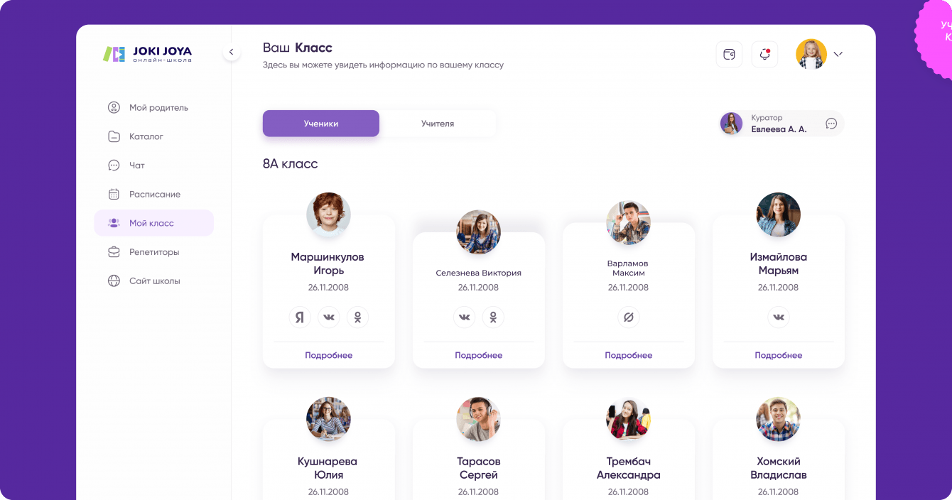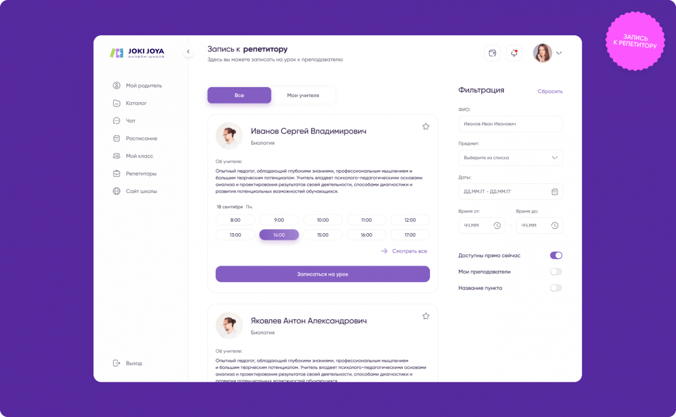 В рамках проекта была реализована LMS с возможностью автоматической записи к репетитору. Платформа содержит в себе возможность проходить учебные материалы, видеть свое расписание и коммуницировать с учителем напрямую. Это стало хорошим фундаментом, чтобы развернуть целую домашную школу.