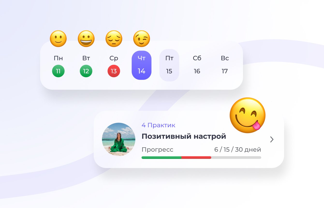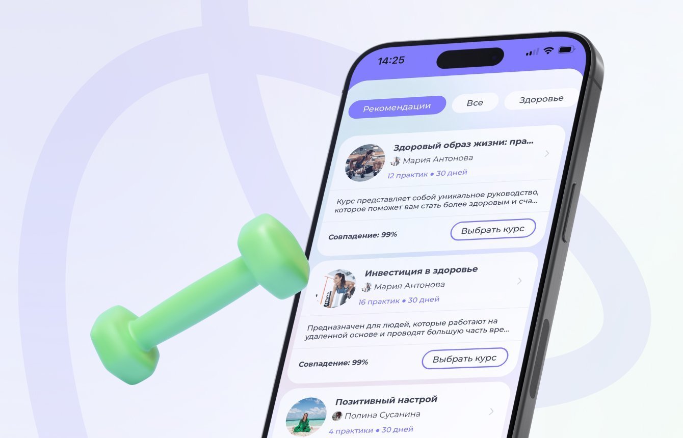 При входе приложение задает пользователю вопросы, чтобы определить текущие проблемы и предложить подходящие курсы. Пользователь может убрать неподходящие ему практики, а также перейти на страничку в социальной сети или сайт эксперта.