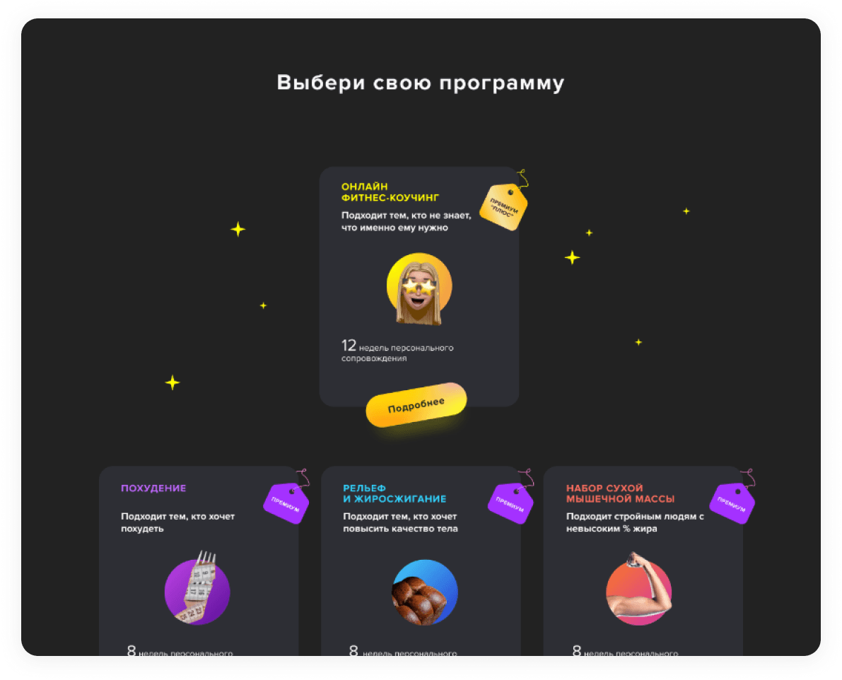 Сайт получился ярким и узнаваемым. За счет нетипичных шрифтов и аватаров он привлекает внимание не только клиентов заказчика, но и пользователей на Behance. Благодаря личному кабинету заказчику удобно видеть всех участников фитнес-программ, отслеживать их результаты и скачивать аналитику.