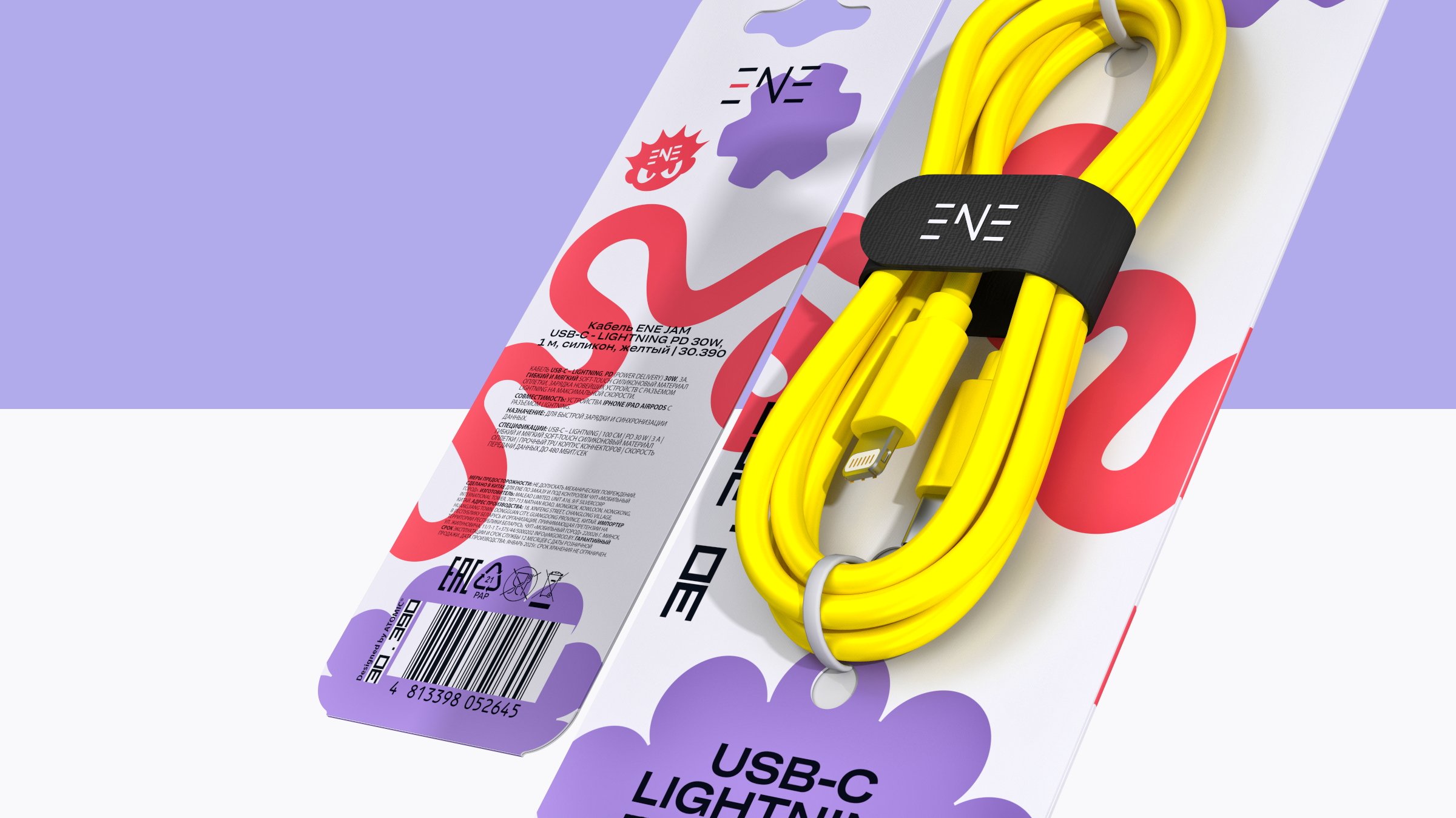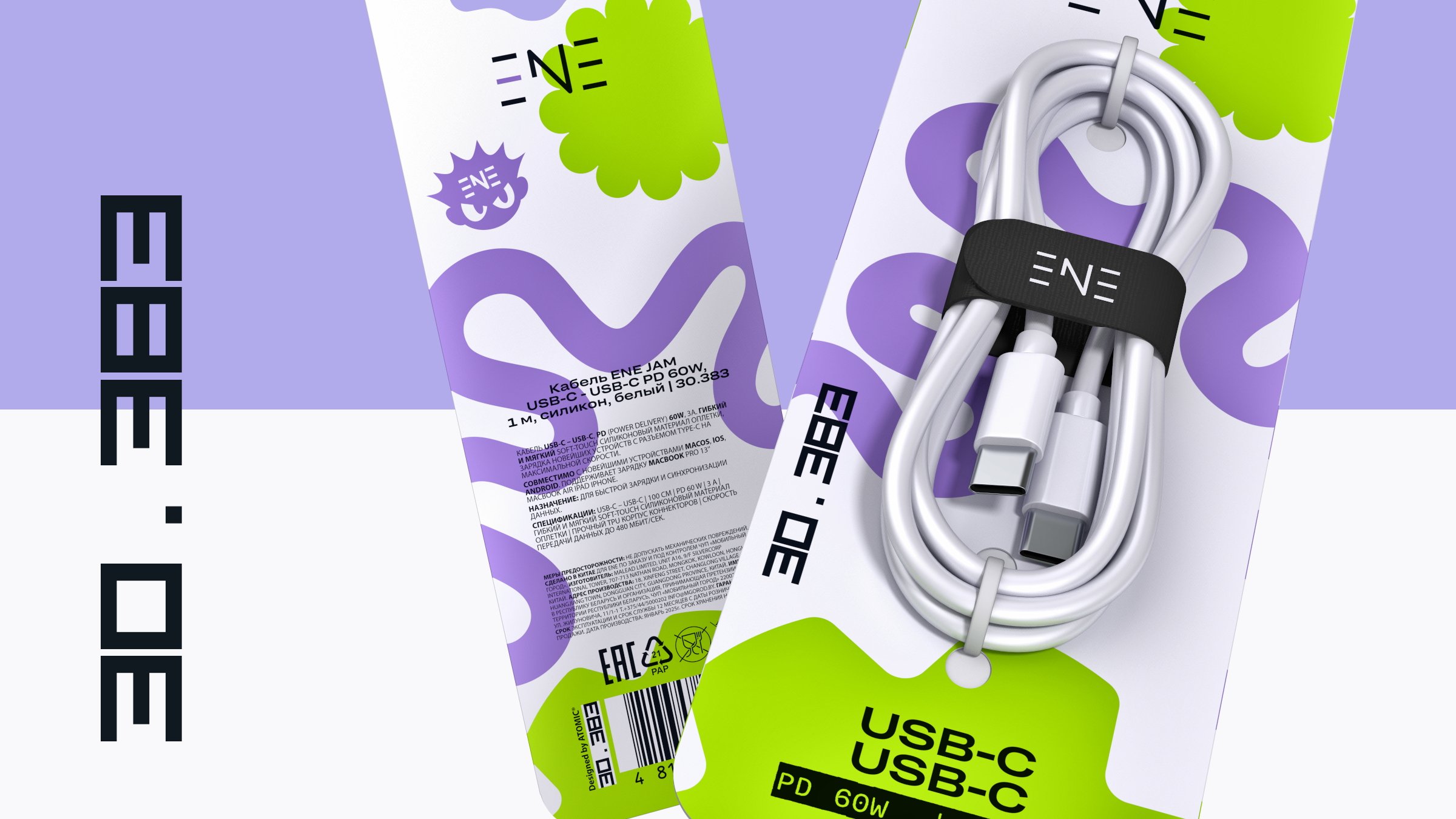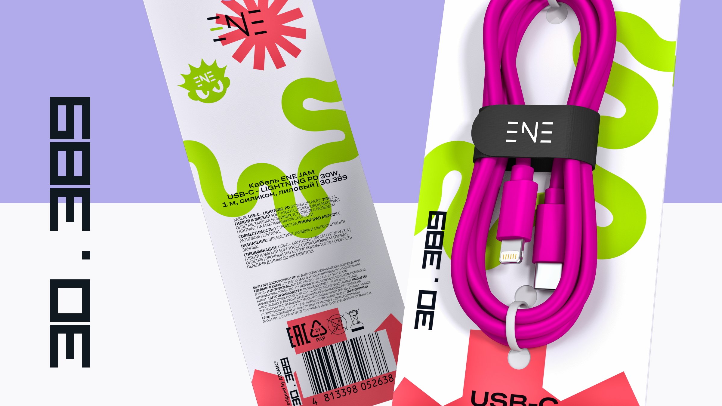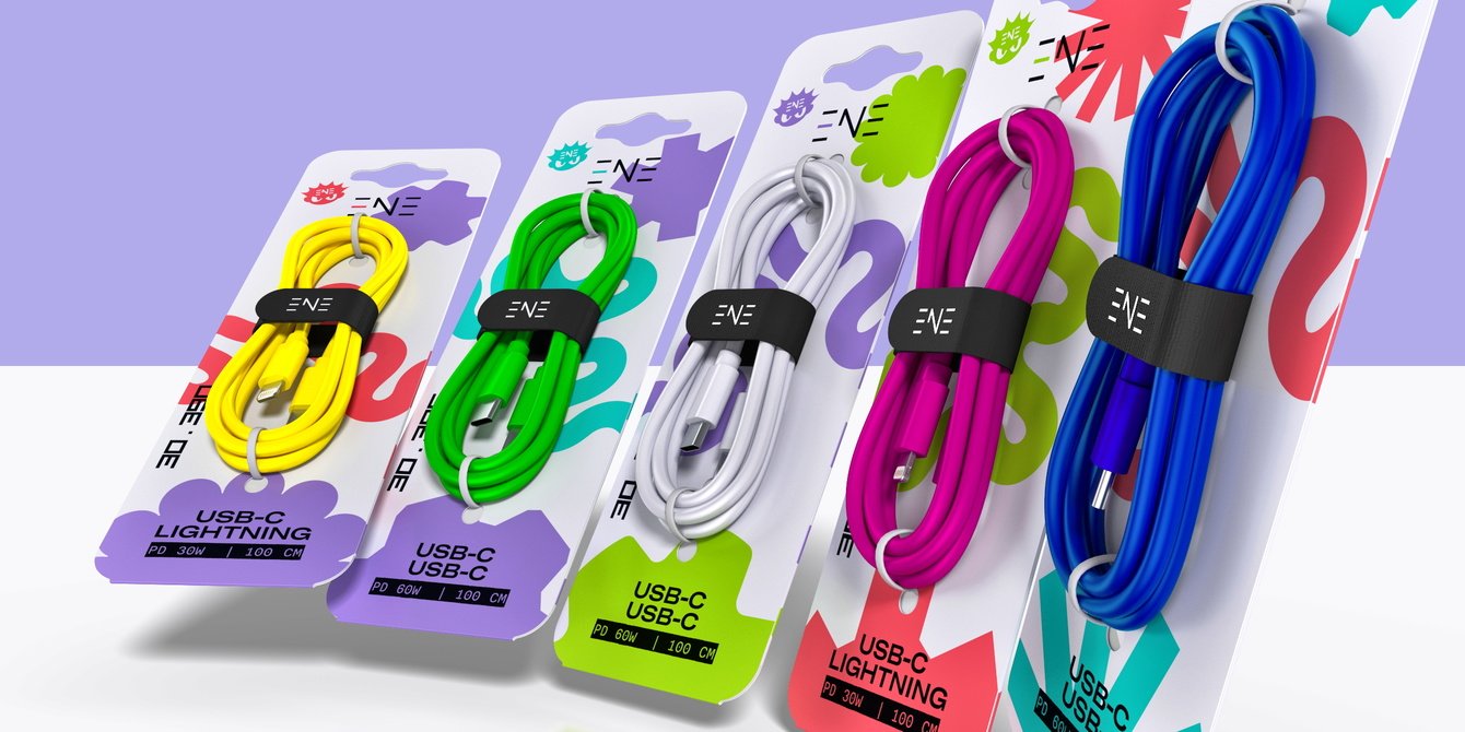 — Графика: Простые плоские формы. Центральный элемент — абстрактная динамичная линия, отсылающая к форме кабеля и заряду энергии. Уникальна для каждого SKU.