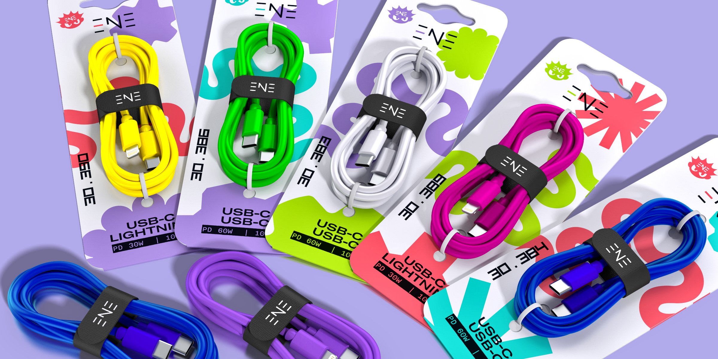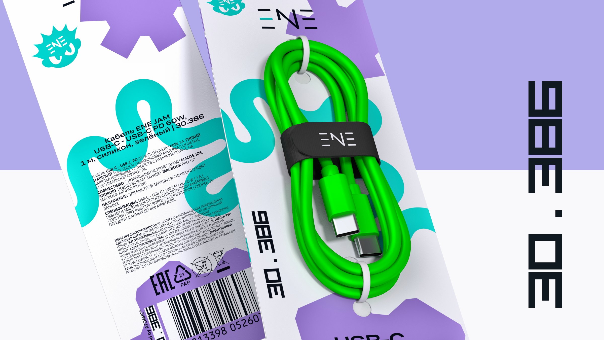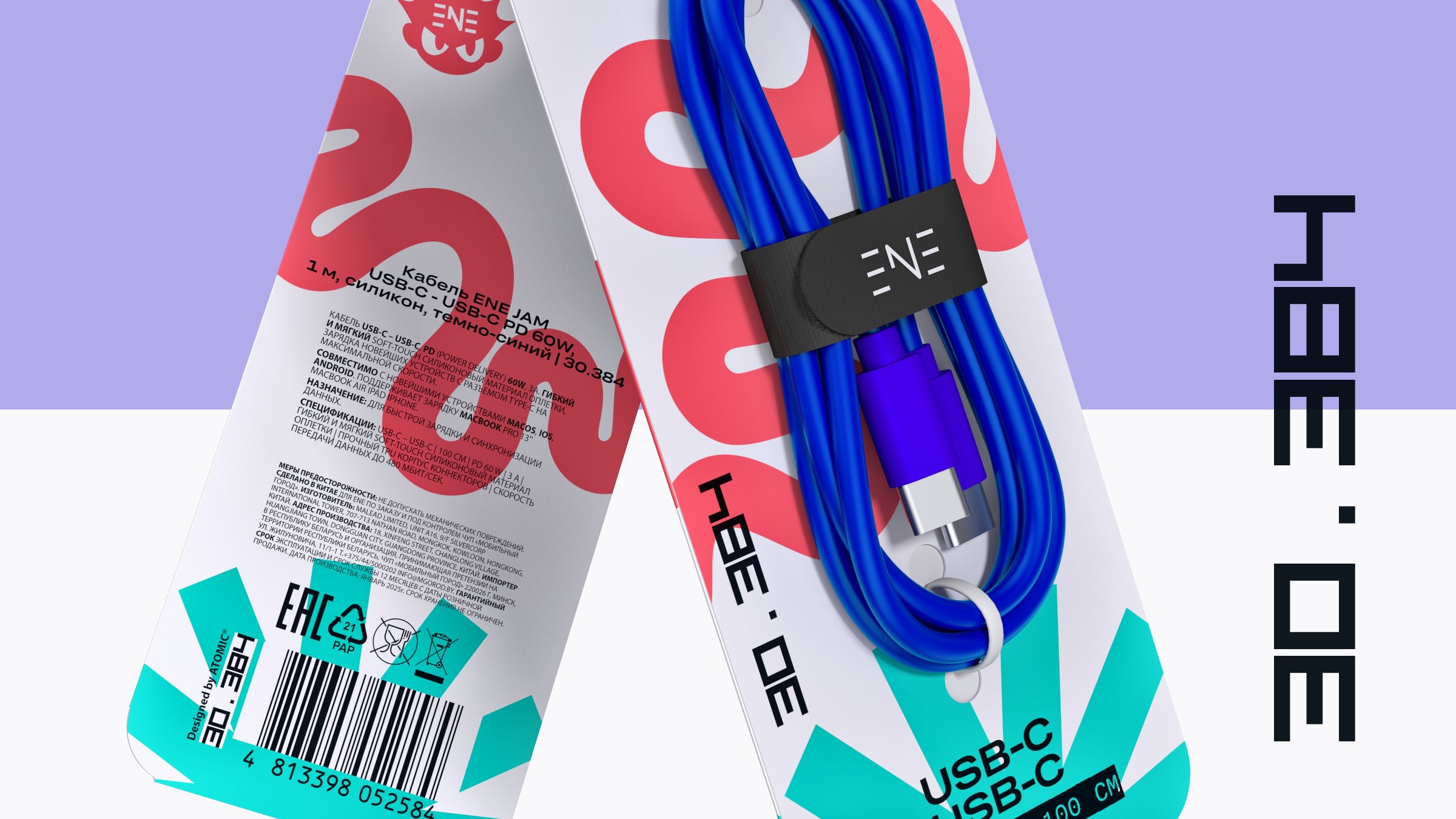 — Графика: Простые плоские формы. Центральный элемент — абстрактная динамичная линия, отсылающая к форме кабеля и заряду энергии. Уникальна для каждого SKU.
