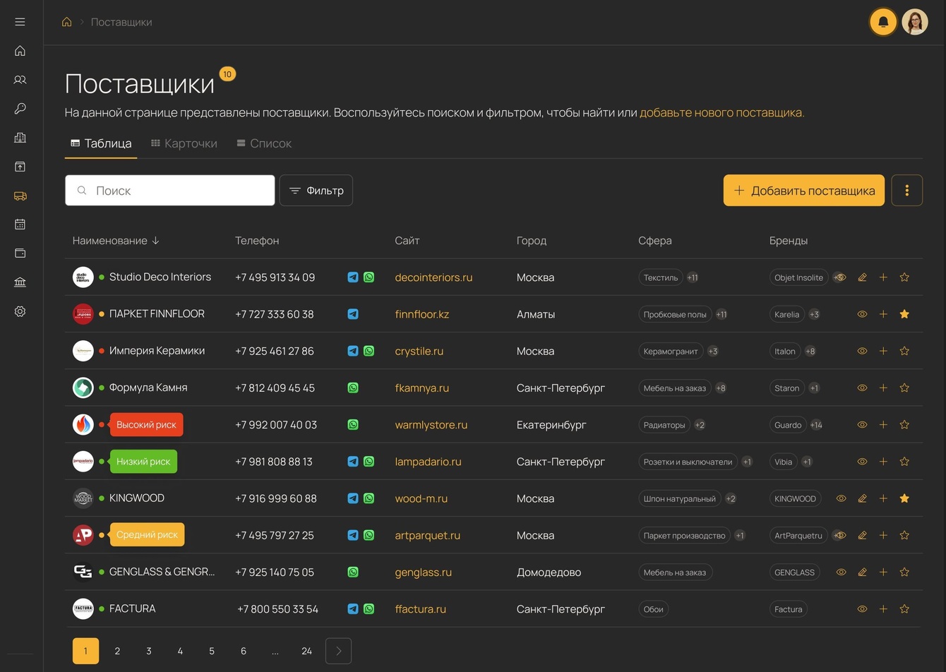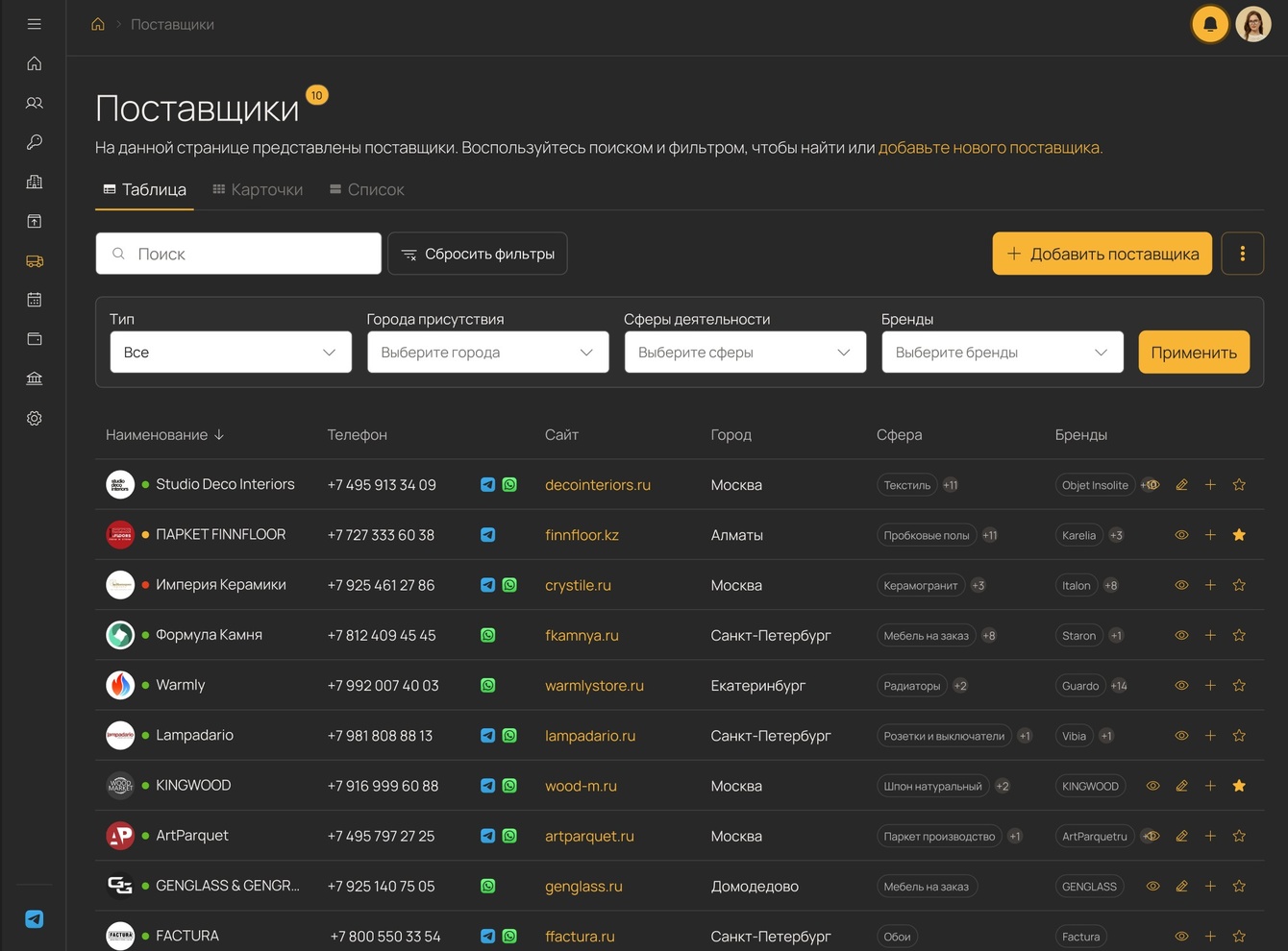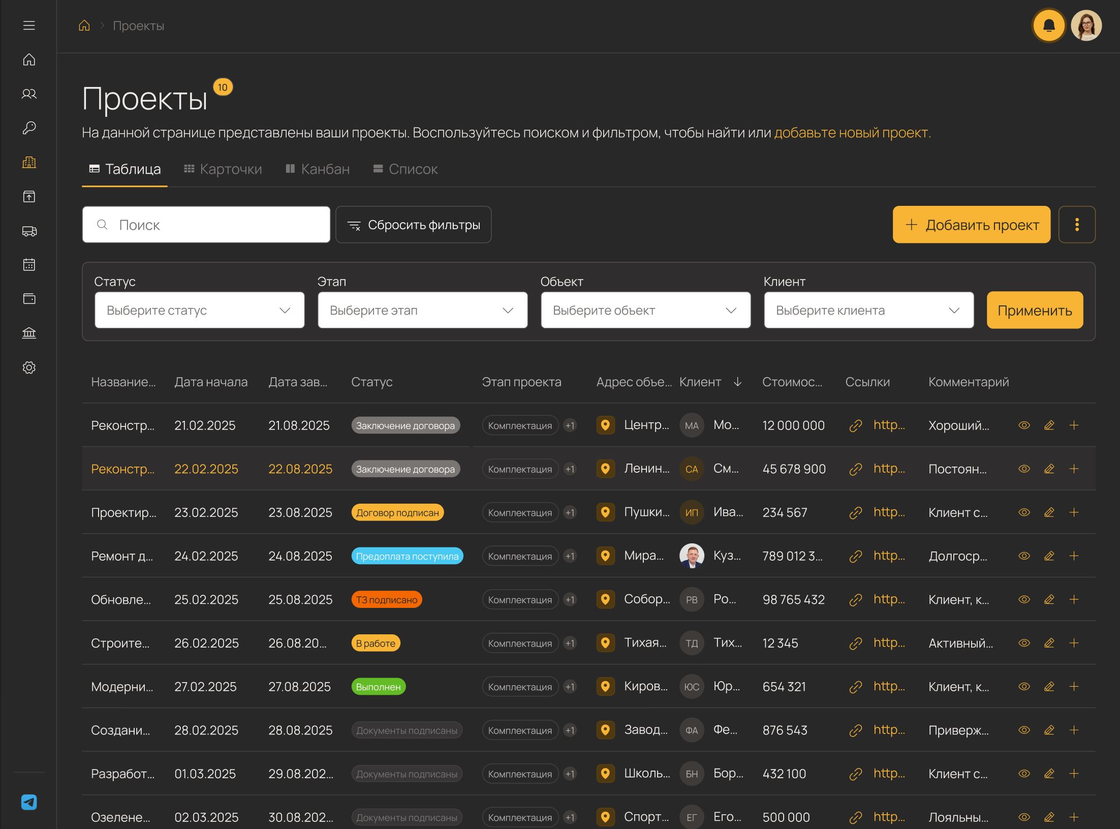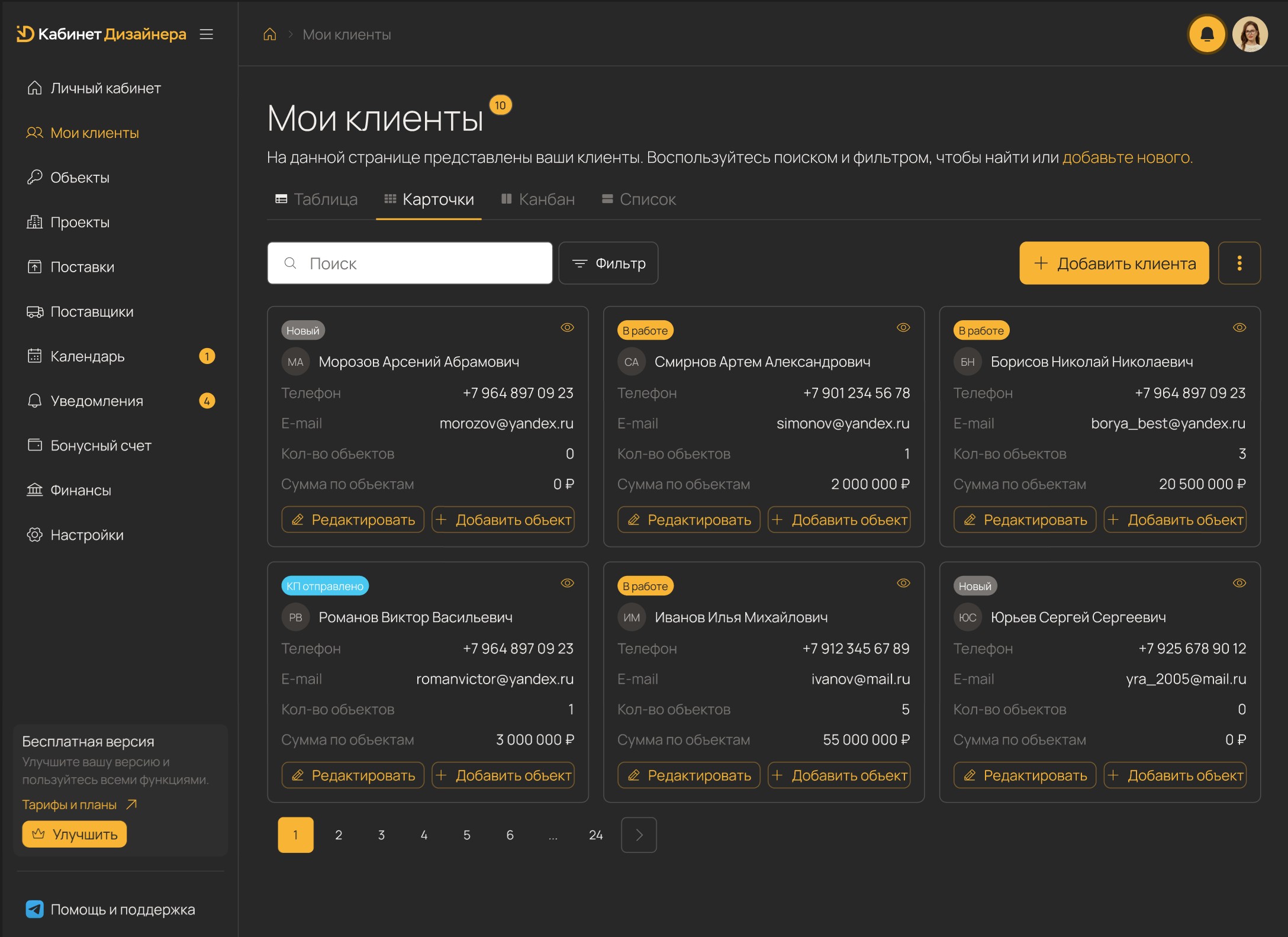 Для разделов Клиенты, Проекты, Поставщики сделали возможность выбора отображения данных - в виде карточек, канбан-доски, списка или таблицы. Кабинет из простого инструмента стал ресурсом, в котором все можно настроить под себя, и это вывело проект на новый уровень взаимодействия с пользователем.