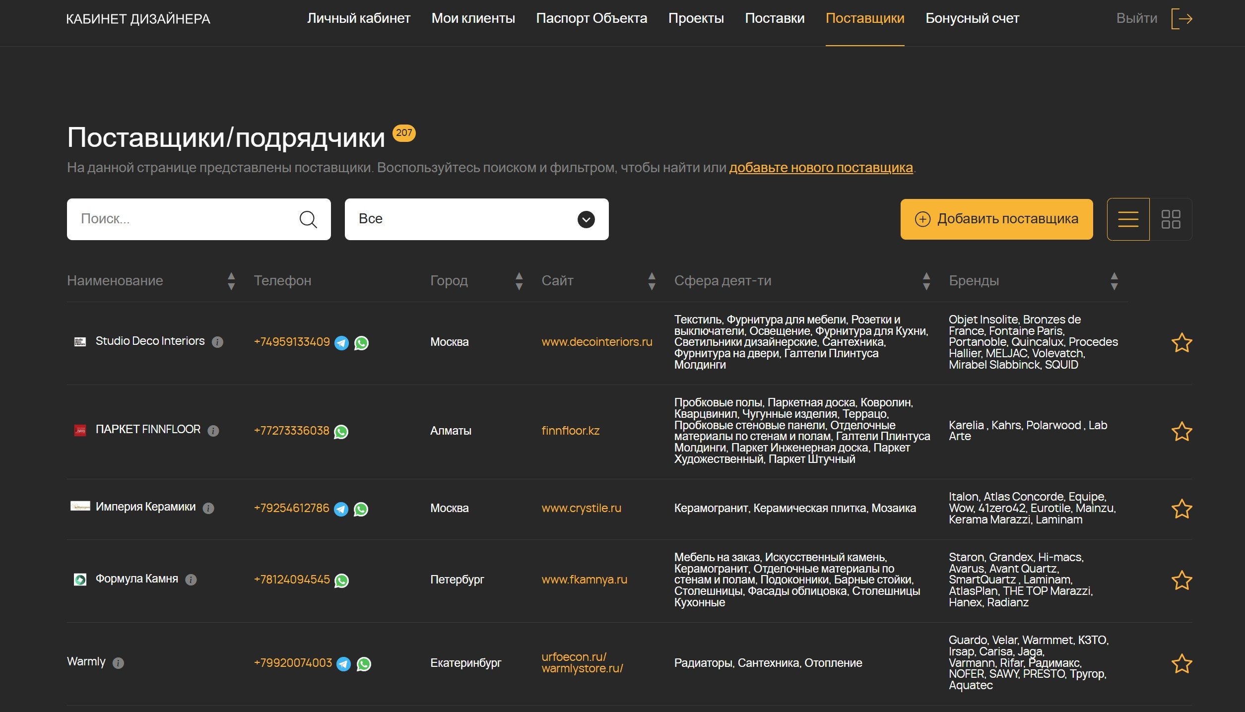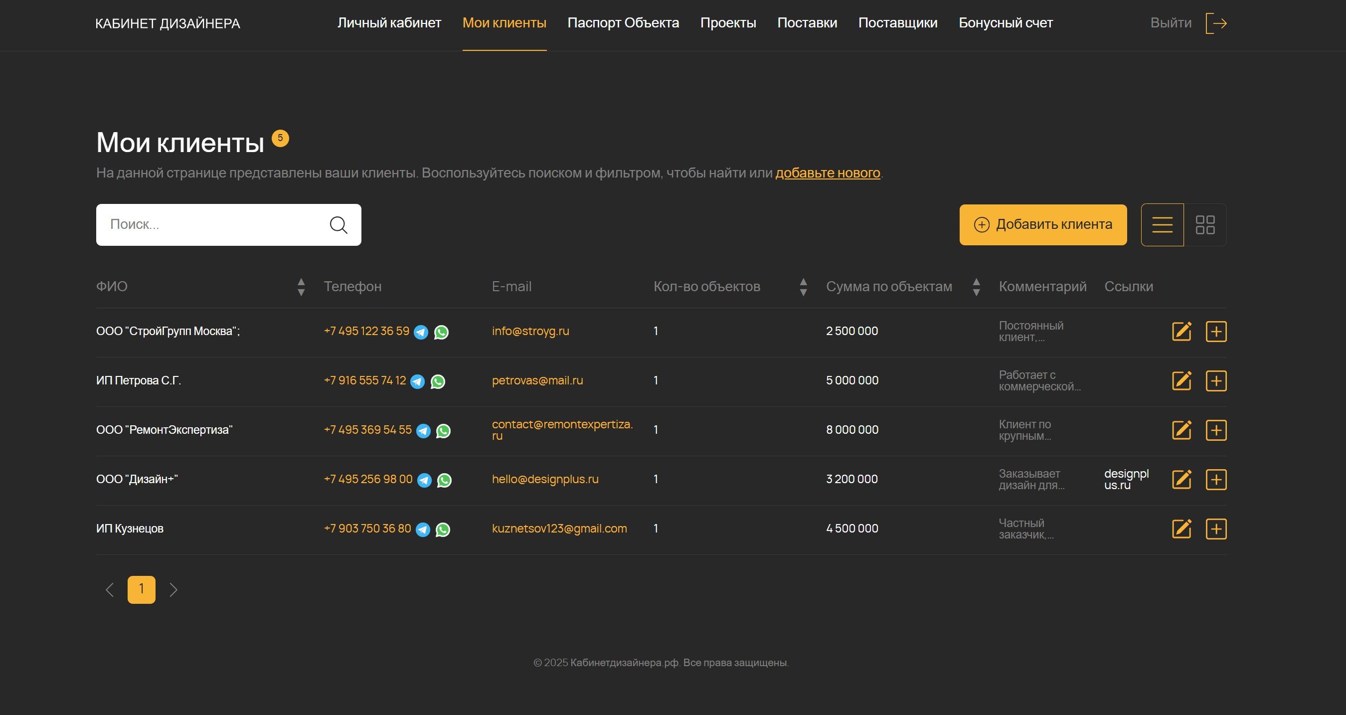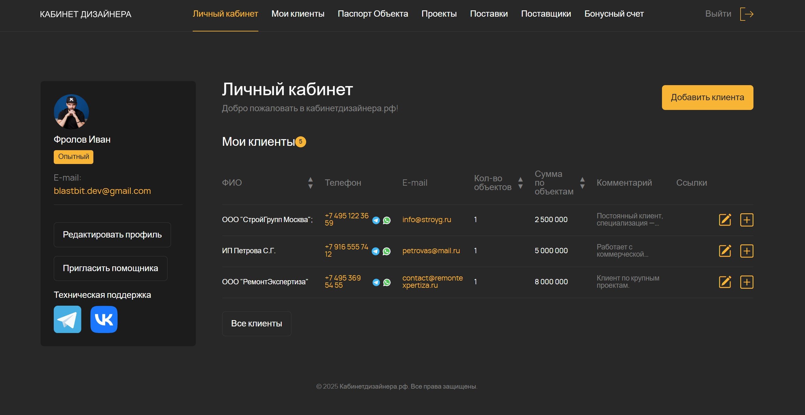 Для разделов Клиенты, Проекты, Поставщики сделали возможность выбора отображения данных - в виде карточек, канбан-доски, списка или таблицы. Кабинет из простого инструмента стал ресурсом, в котором все можно настроить под себя, и это вывело проект на новый уровень взаимодействия с пользователем.
