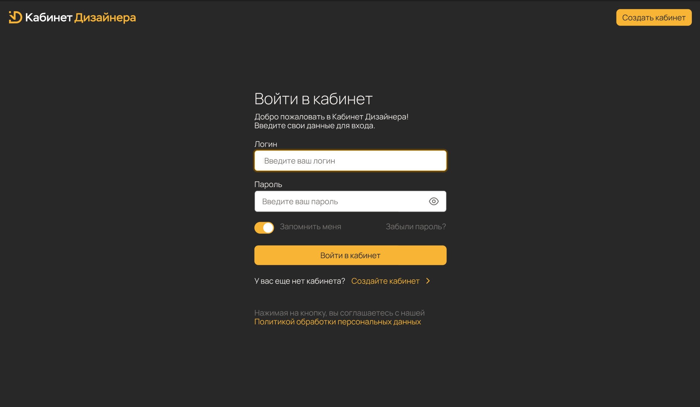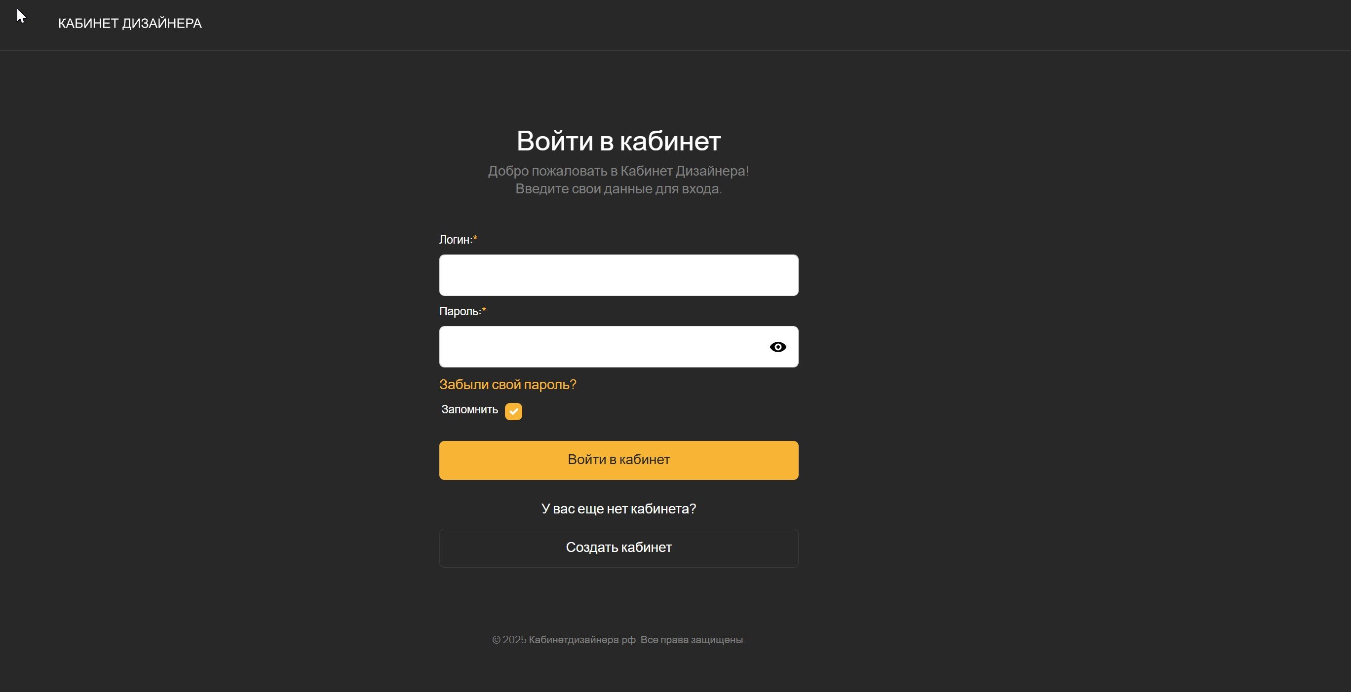 Изначально у Кабинета дизайнера не было главной страницы, пользователю сразу предлагался вход в личный кабинет. Сайт был сделан на самописной CMS, без дизайна, интегрирован с облачной Битрикс24.