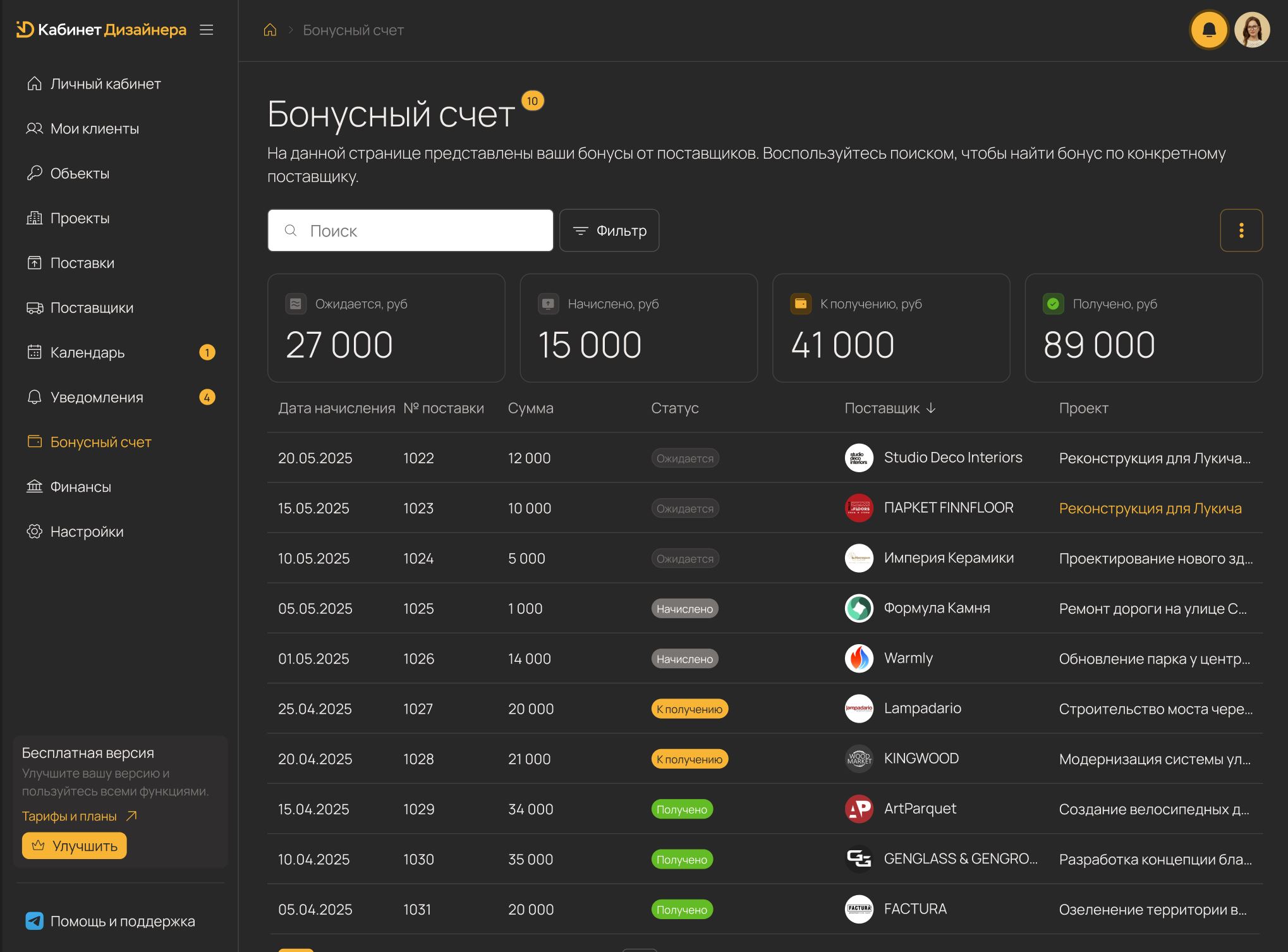 ● взаимодействие "дизайнер - поставщик" выведено на новый уровень, а бонусная система помогает укрепить это сотрудничество;