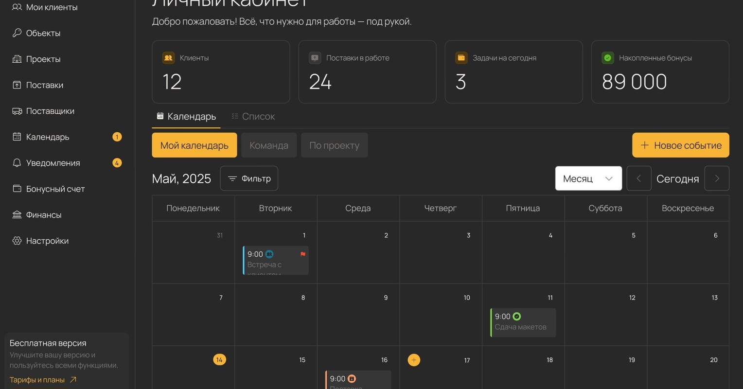 - значительно расширить функционал Кабинета, настроив календарь, управление проектами, взаимодействие с клиентами и поставщиками, бонусную систему.