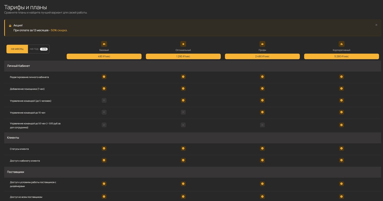Важным этапом стала монетизация проекта. Для пользователей были настроены разные тарифные планы, предусматривающие ведение проектов разного масштаба. Тарифы позволяют пользователю выбрать оптимальный — от небольших частных заказов в рамках своего города, до глобальных задач на всероссийском уровне.