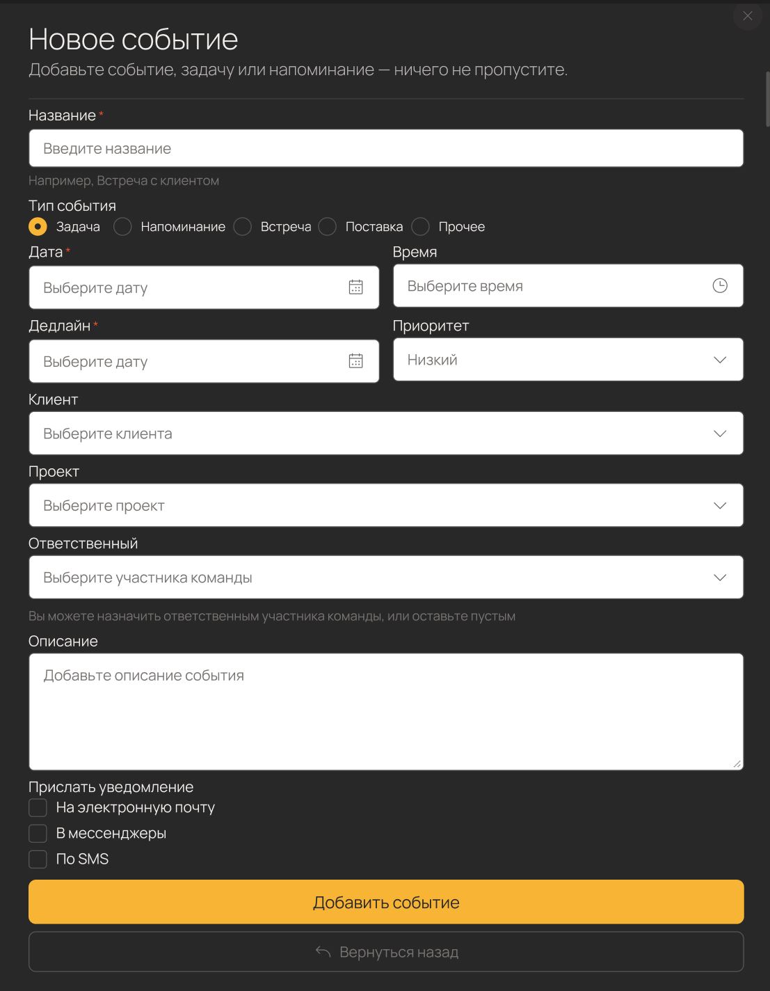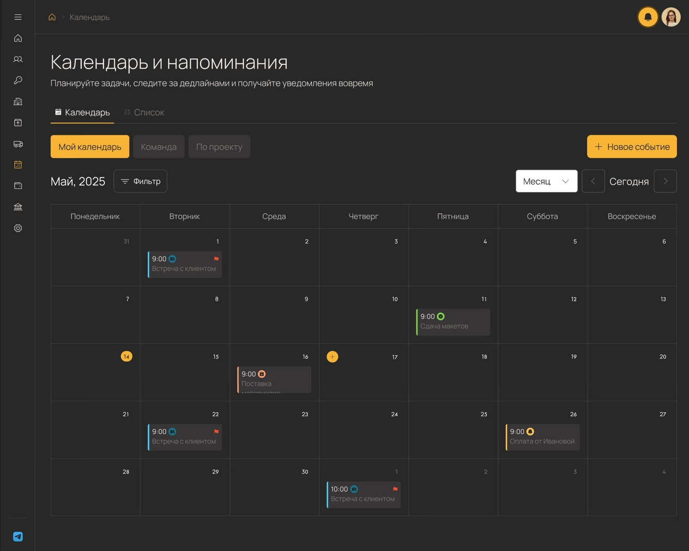 Календарь также получил значительное расширение функционала. Теперь в нем стало возможным отображать события не только за выбранный период, но и с фильтрацией по команде исполнителей или проекту. Также заработала система уведомлений, чтобы ни один дедлайн не был пропущен.
