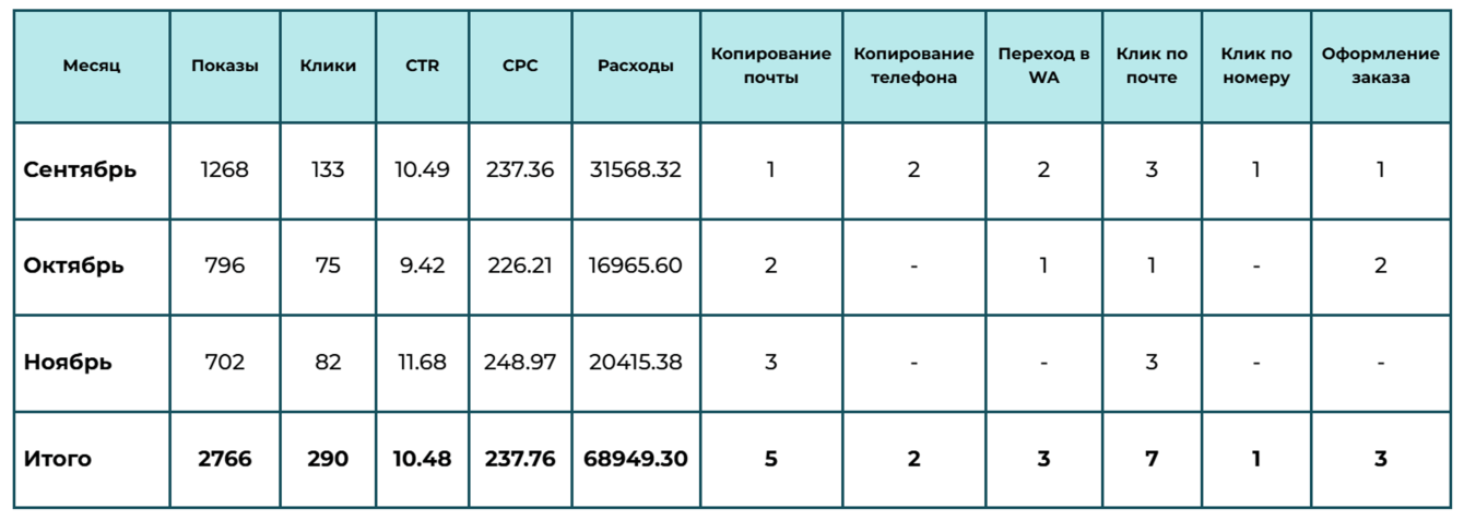 Прогнозируемый бюджет 55 000 руб., но мы понимали, что для узкой семантики этого много. Задача — максимально эффективно использовать каждый рубль, фокусируясь только на конверсионных каналах.