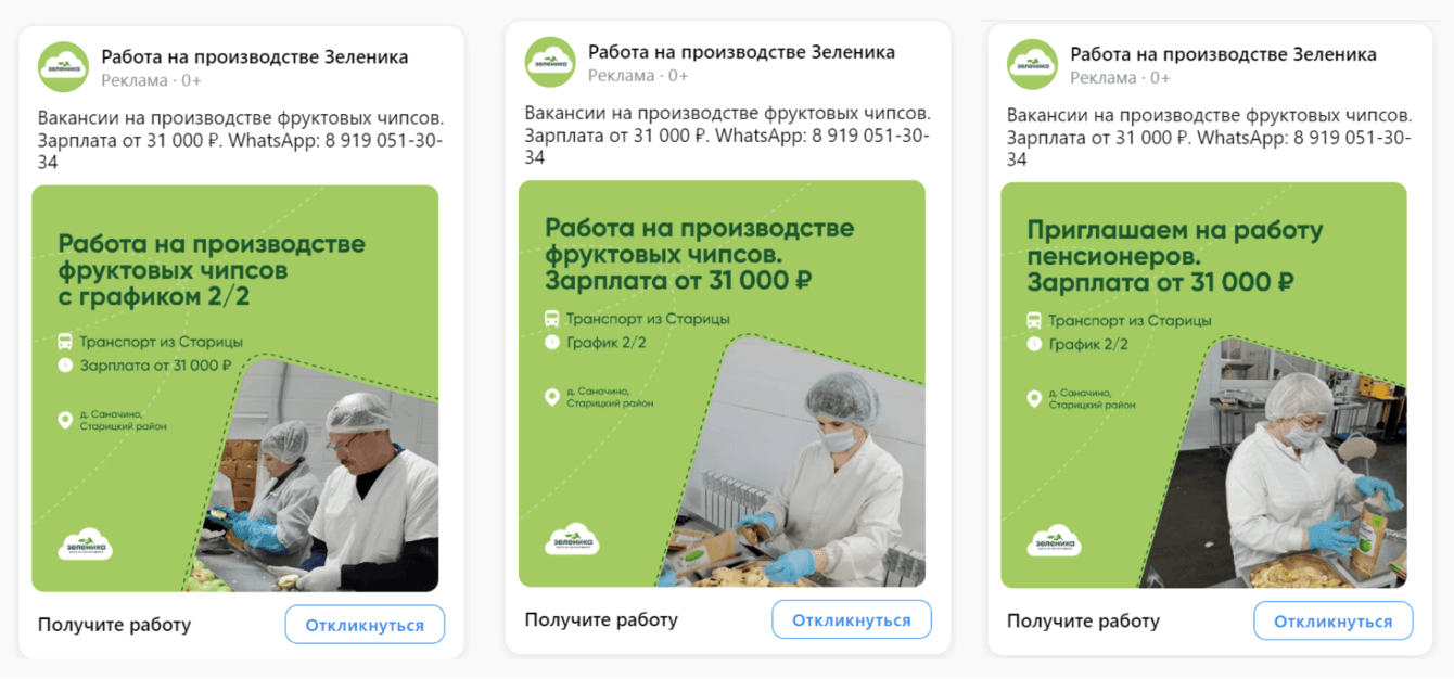 Так как мы уже давно работаем с массовым подбором персонала на линейные позиции, мы знаем, что лучше всего работают объявления без упоминания вакансии, например — «Работа на производстве чипсов». По нашему опыту конверсия в отклик по таким объявлениям выше на 26%, чем по объявлениям с указанием конкретной вакансии. Именно такие рекламные объявления мы подготовили для Зеленики.
