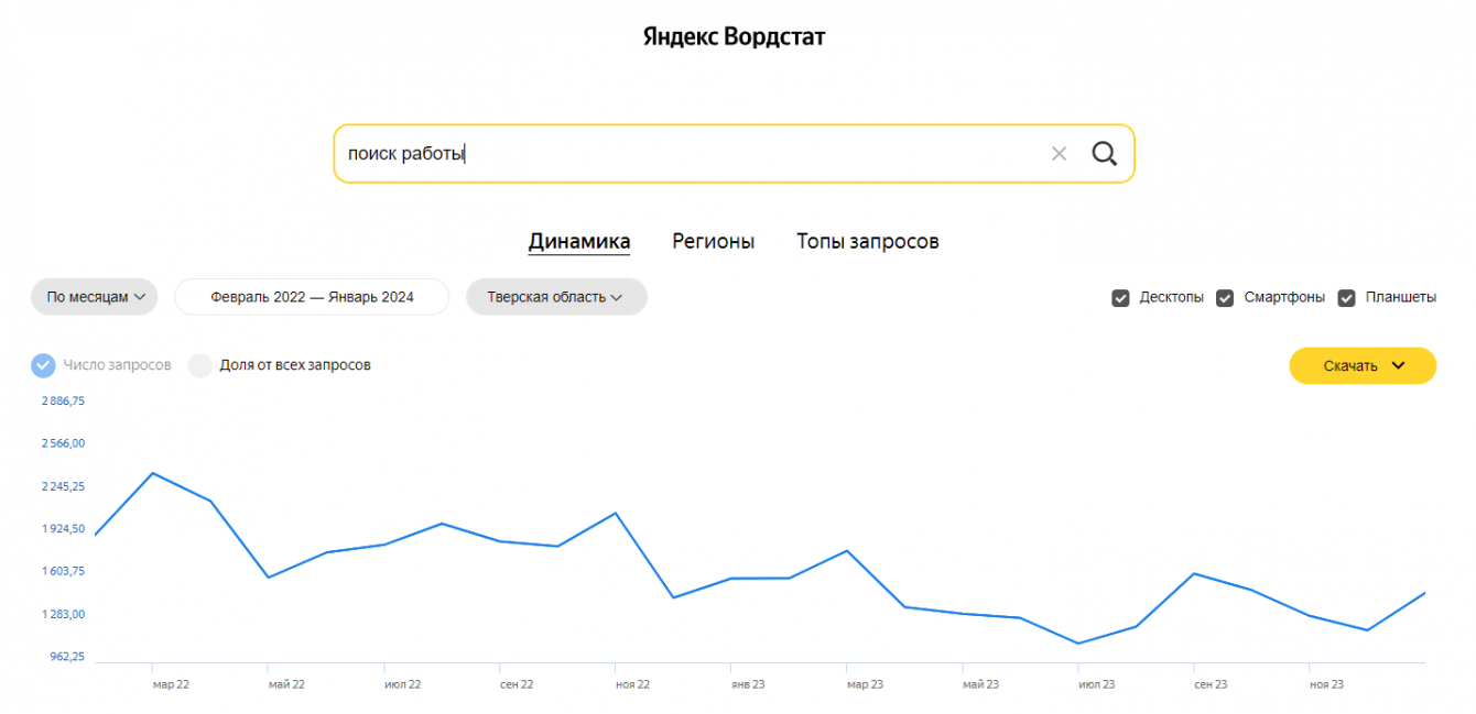 График поискового спроса по сервису wordstat-2.yandex.ru по запросу «поиск работы» в Тверской области