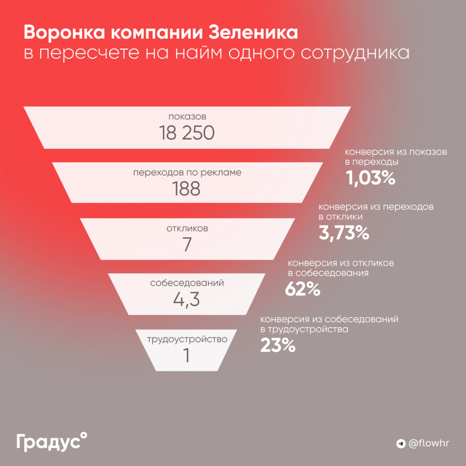 Безусловно высокая конверсия в трудоустройство это заслуга не только точных настроек таргетинга, но и отличной работы рекрутеров компании. Этот показатель во многом зависит от скорости качества обработки входящих откликов. У Зеленики эти процессы отстроены на отлично. Уверены, что в высокий сезон рекрутинга можно получить показатели еще выше.
