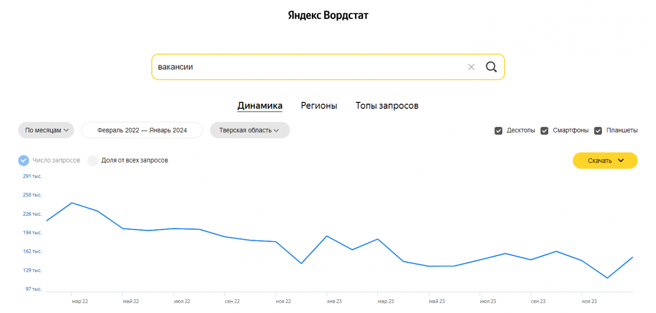 Клиент обратился к нам в декабре 2023 года — один из низких сезонов в рекрутинге. По статистике wordstat-2.yandex.ru интерес к вакансиям и поиску работы начинает снижается уже с конца ноября и возвращается только в январе.