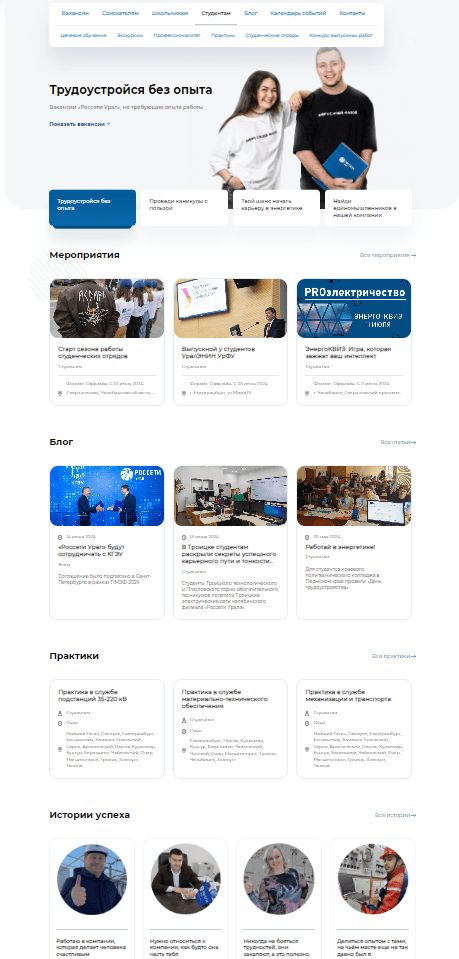 - Для подачи контента мы спроектировали новые модули: «Мероприятия», «Блог» и «Истории успеха». Для коммуникации со студентами придумали модуль «Практики». Сделали возможность записаться на экскурсию или практику.