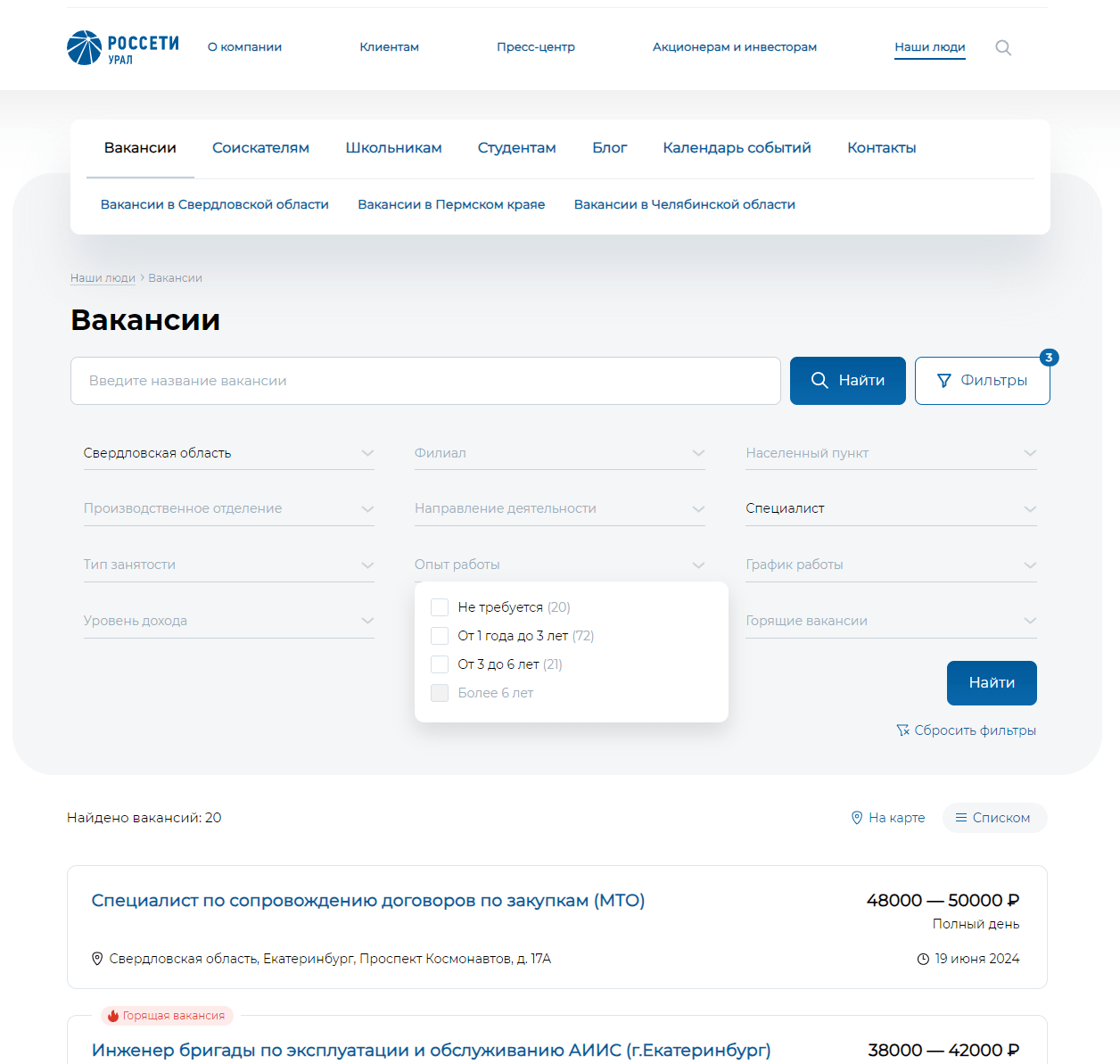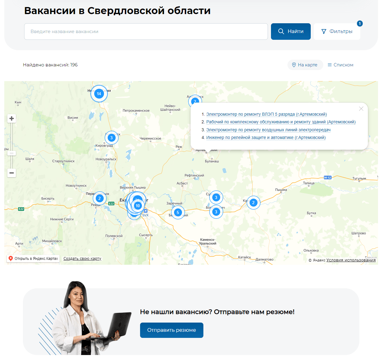 - Ядром раздела, конечно, стал модуль «Вакансии». Поскольку компания территориально распределена, вакансии демонстрируются не только списком, но и в привязке к карте.