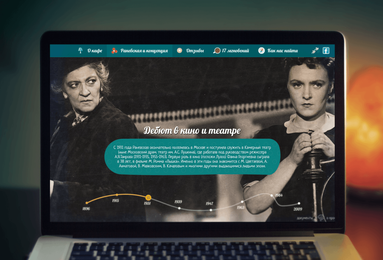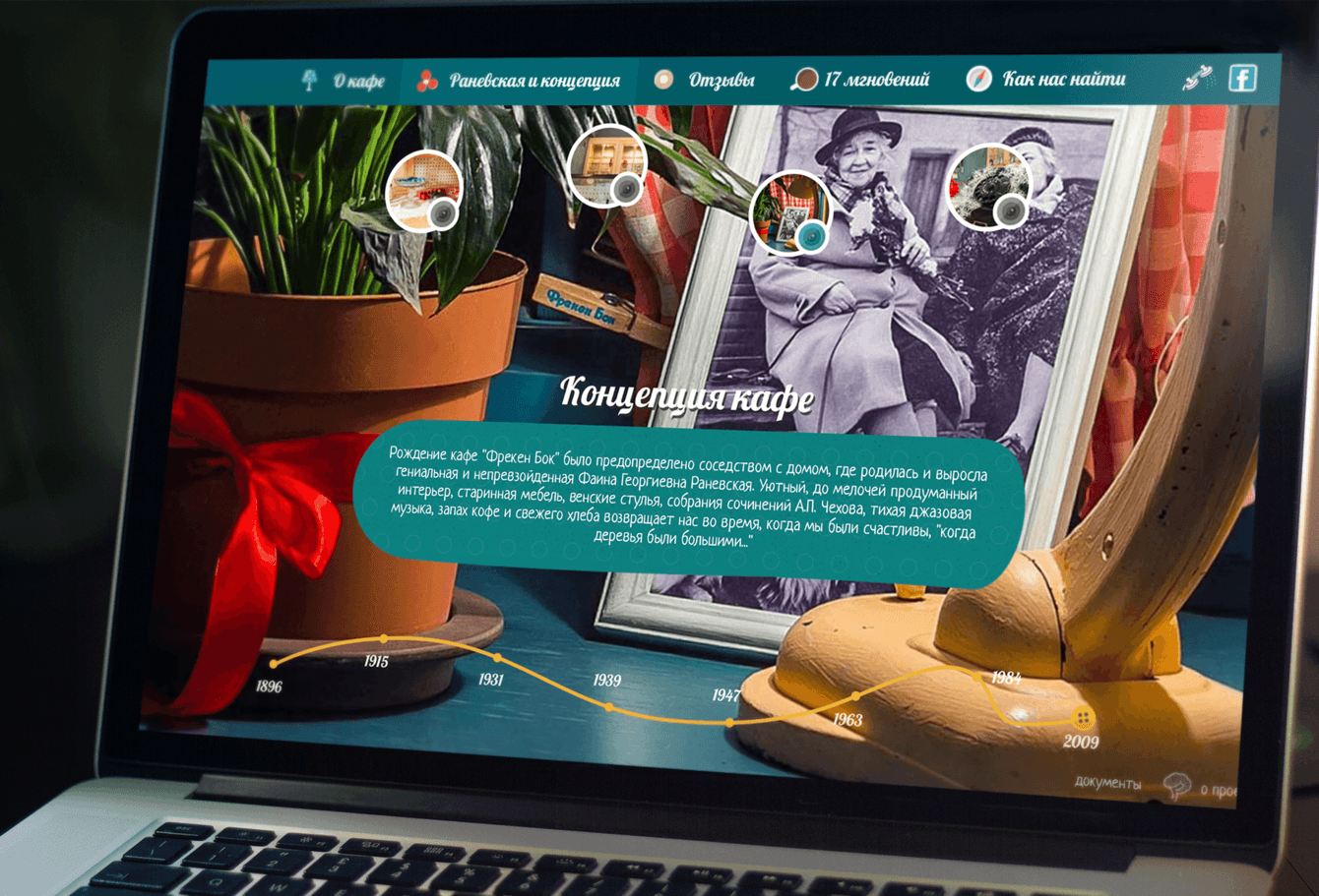 Поскольку, концепция кафе тесно переплетается с жизнью Фаины Раневской, было решено сделать таймлайн с ключевыми точками ее жизни и карьеры, заканчивающийся открытием кафе Фрекен Бок, где ее дух и настроения остаются править навсегда. На протяжении полугода мы продумывали мельчайшие детали, посещали выставочный зал с вещами Фаины Раневской, поднимали архивы старейшей библиотеки в поисках уникальных фотоснимков актрисы.