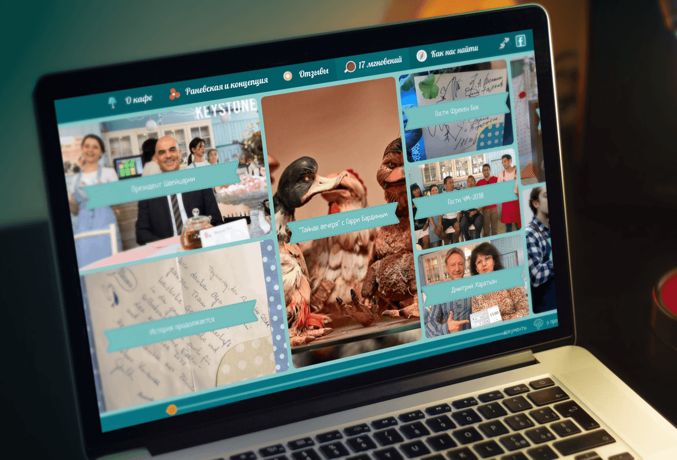 История кафе содержит много ярких моментов, встреч с известными актерами, режиссерами, мультипликаторами и даже с президентом Швейцарии. Об этом рассказывает раздел на сайте с названием "17 мгновений".