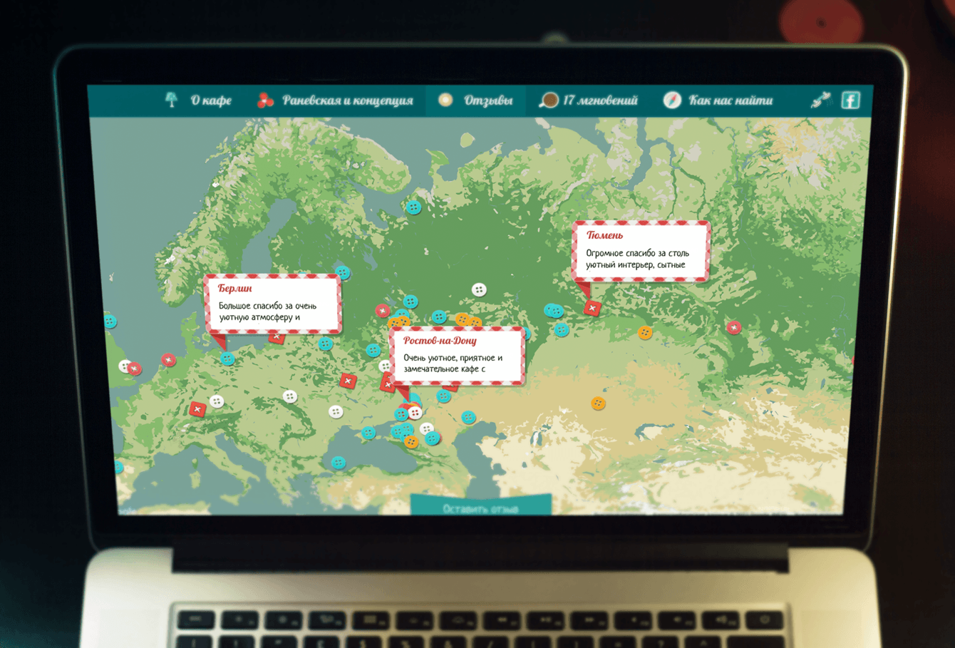 В кафе находится 6 книжек исписанных теплыми отзывами от простых гостей и мировых звезд, проживающих в разных городах и странах. Мы решили перенести все отзывы в электронный вид и привязать их к городам, от куда прибыли гости. Также на сайте любой желающий может написать свой отзыв, и если будет указан город, то отзыв сразу появится на карте.