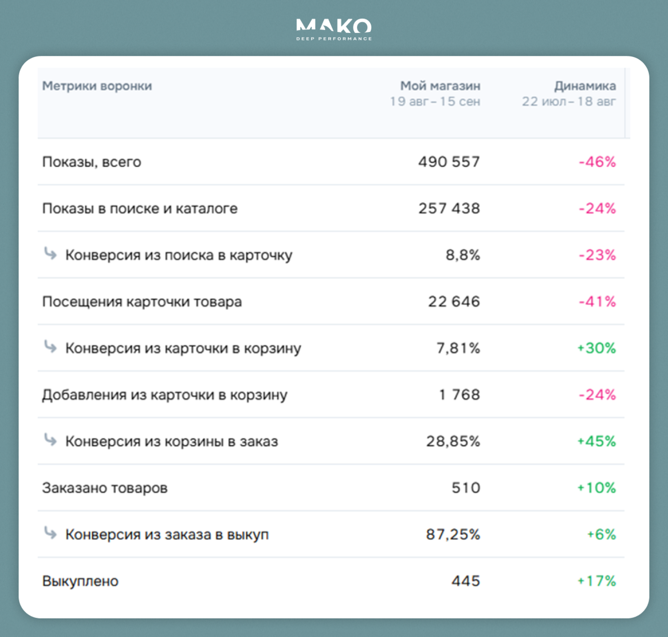 Изменение стратегии рекламы и участия в акциях, доработка карточек позволили увеличить конверсию на всех этапах воронки: