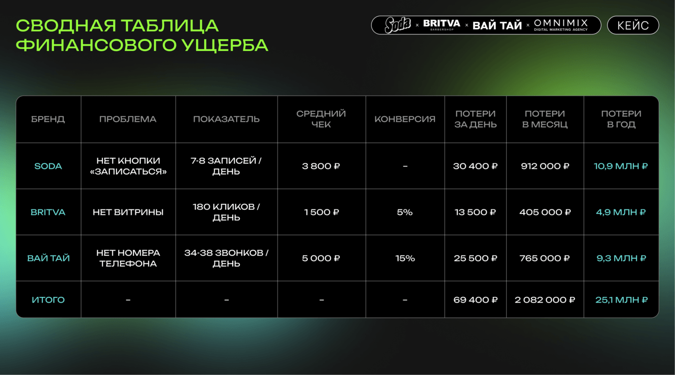 22 апреля команда OMNIMIX обнаружила технический сбой в карточке одного из филиалов сети салонов красоты Soda — исчезла кнопка "Записаться онлайн". Это тот самый элемент, который ежедневно генерировал 20 кликов и приводил к 7-8 записям с средним чеком 3 800 рублей.
