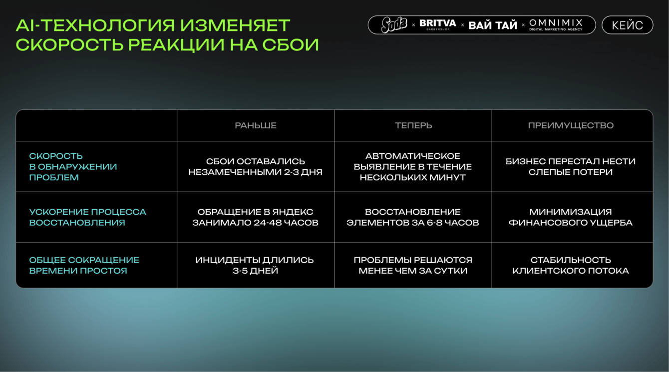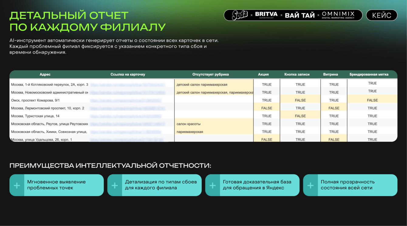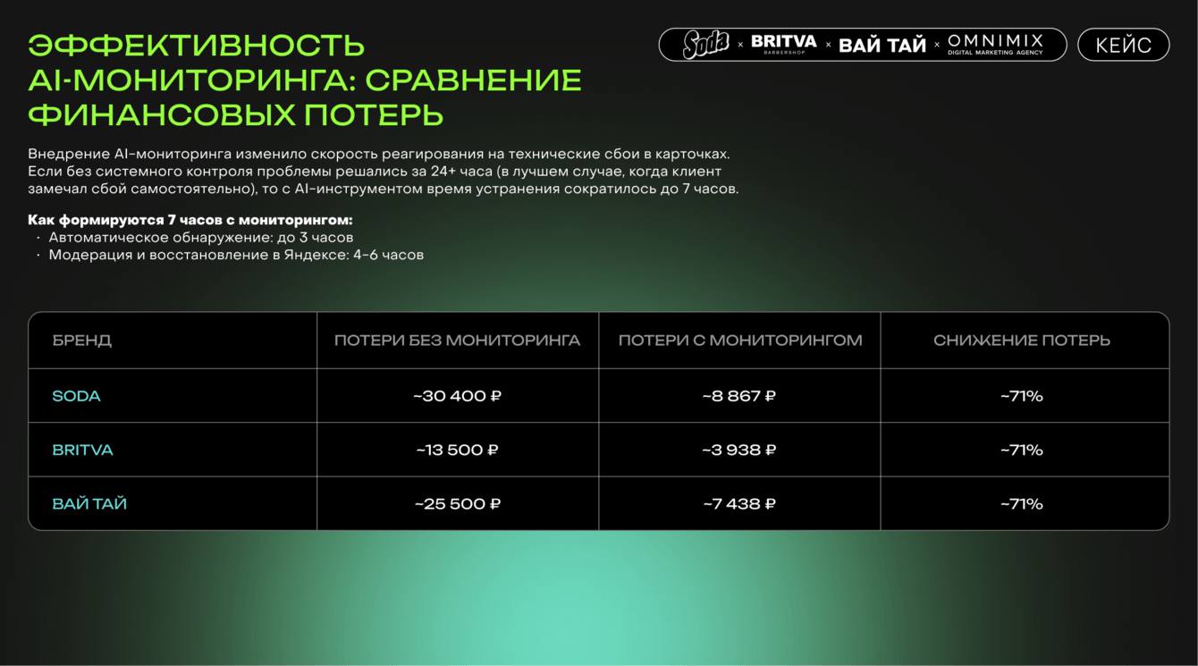 Внедрение усовершенствованного AI-инструмента кардинально изменило подход к контролю карточек на Яндекс Картах. Если раньше ошибки могли оставаться незамеченными по 2-3 дня, все это время бизнес терял клиентов и деньги, то теперь система выявляет проблему в течение нескольких минут, а команда сразу приступает к устранению.