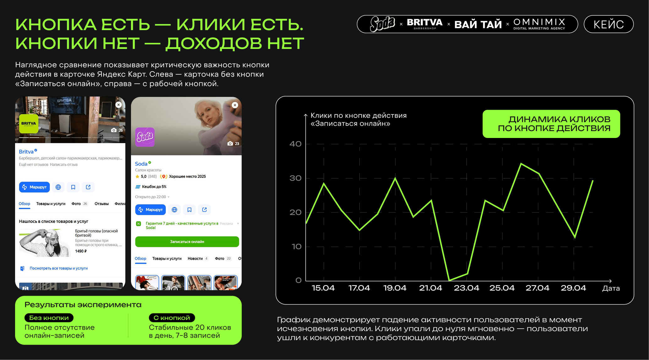 22 апреля команда OMNIMIX обнаружила технический сбой в карточке одного из филиалов сети салонов красоты Soda — исчезла кнопка "Записаться онлайн". Это тот самый элемент, который ежедневно генерировал 20 кликов и приводил к 7-8 записям с средним чеком 3 800 рублей.