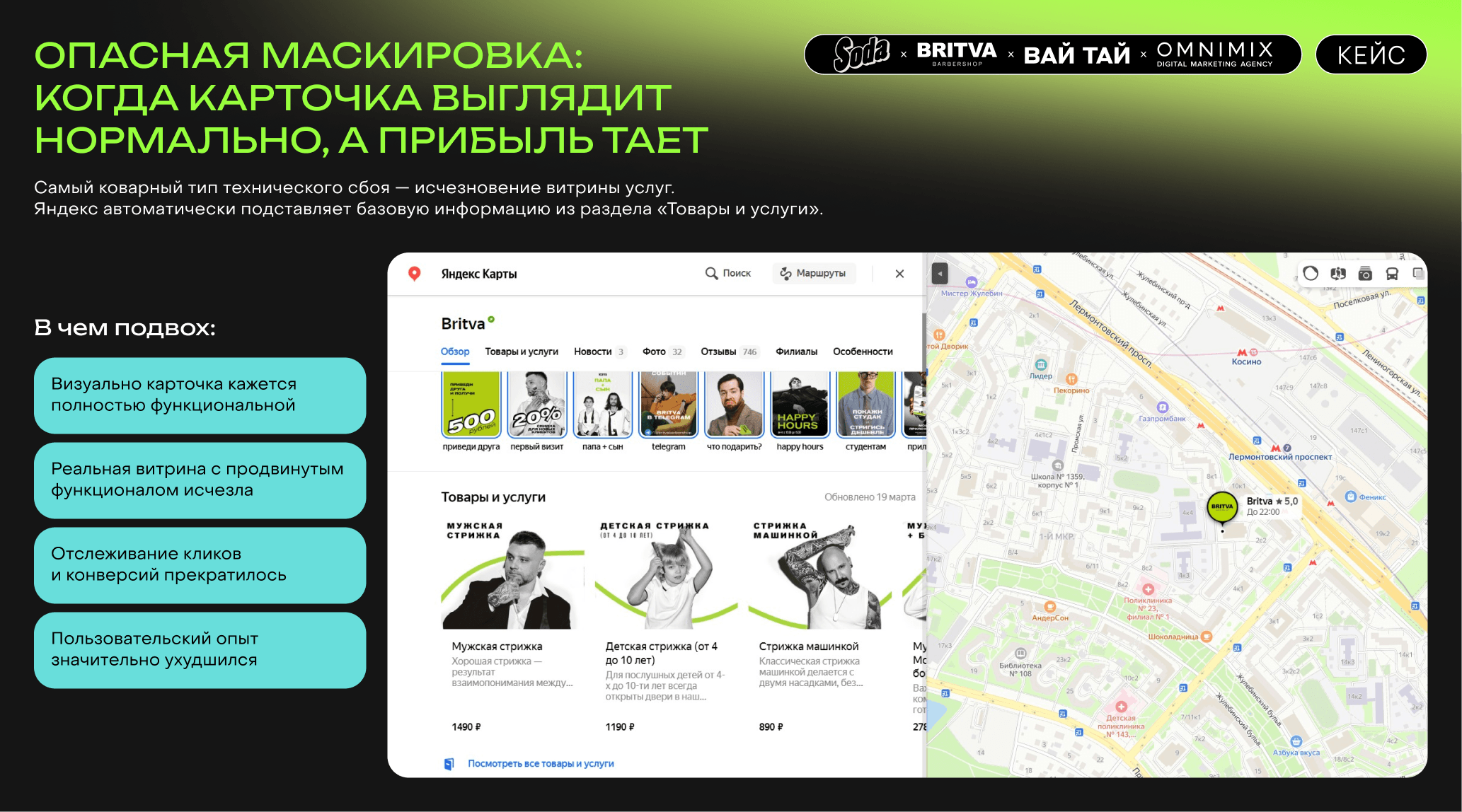 15 мая удар пришелся по сети барбершопов Britva. Из карточки одного филиала исчезла витрина услуг — элемент, который стабильно приносил 180 кликов в день от пользователей, заинтересованных в конкретных услугах.