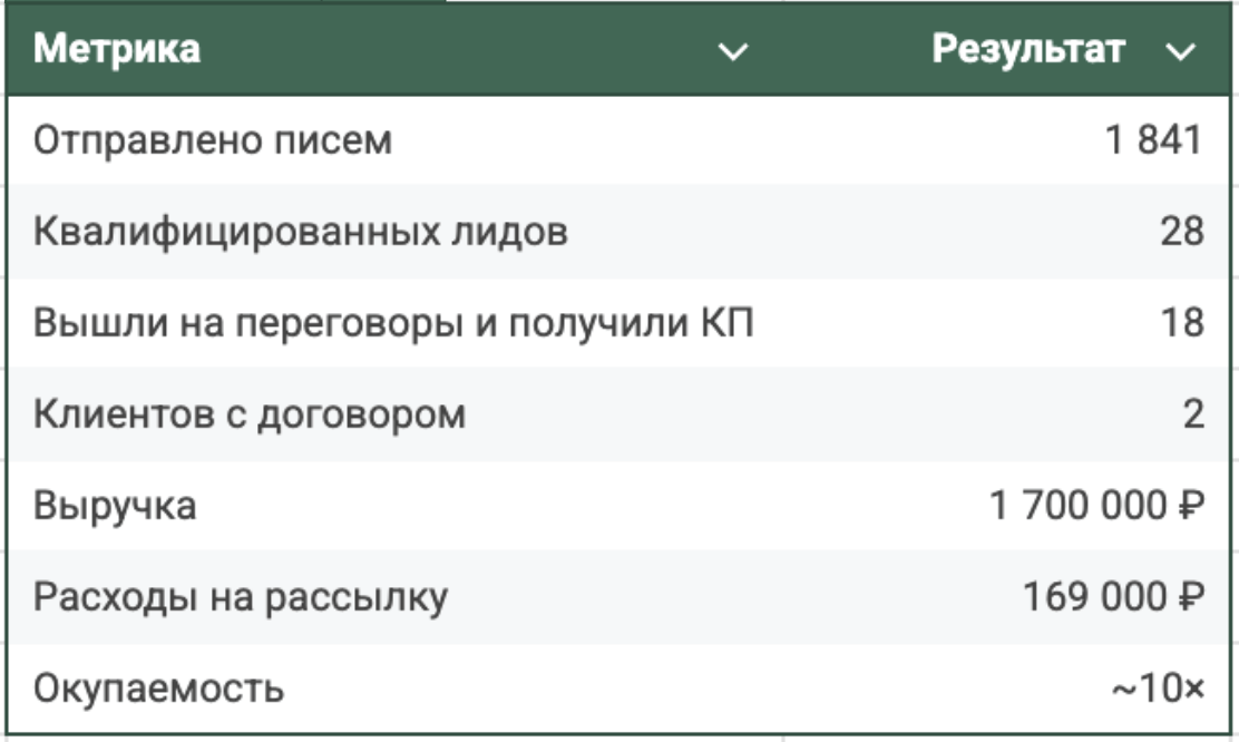 Теперь к самому главному, к результатам. С рассылки пришло 28 квалифицированных лидов, из них 18 компаний вышли на встречу и получили персональное КП. Среди них был и «ярдные» проекты. А это крутой результат!