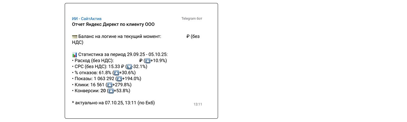 Запустили Telegram‑бота, который поставлял клиенту аналитику. Клиент мог за пару минут оценить ситуацию по лидам и CPL без отдельных запросов к специалистам, что экономило время и ускоряло принятие решений.