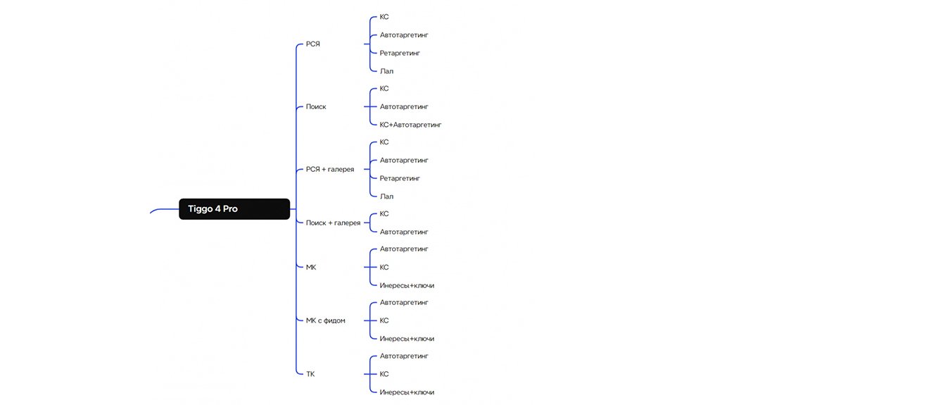 Стартовали с глубокого аудита текущих кампаний и подготовки майндмэпа, в котором наглядно расписали этапы работ, логику ресурсов и точки контроля по всей воронке.