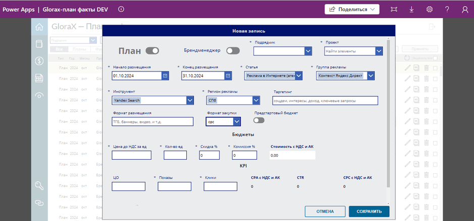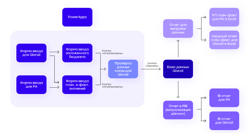 Интеграция Power Apps с Power BI обеспечила прямое попадание плановых и фактических данных в отчётность.