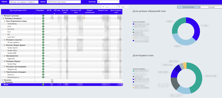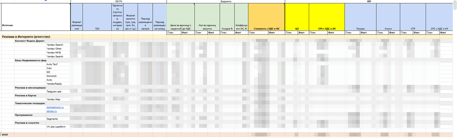 Для автоматизации фактических и плановых затрат нужно было придумать решение. Дело в том, что интеграции с рекламными кабинетами для девелоперов можно настроить не на всех площадках. Чаще всего это невозможно технически. Кроме того, нужно учитывать, что у каждого проекта свой рекламный сплит инструментов, который может меняться из месяца в месяц. Следовательно, интеграций нужно много. Ещё одна сложность заключается в том, что в списке рекламных инструментов есть источники, которые не подразумевают наличие рекламных кабинетов. Например, наружная реклама.