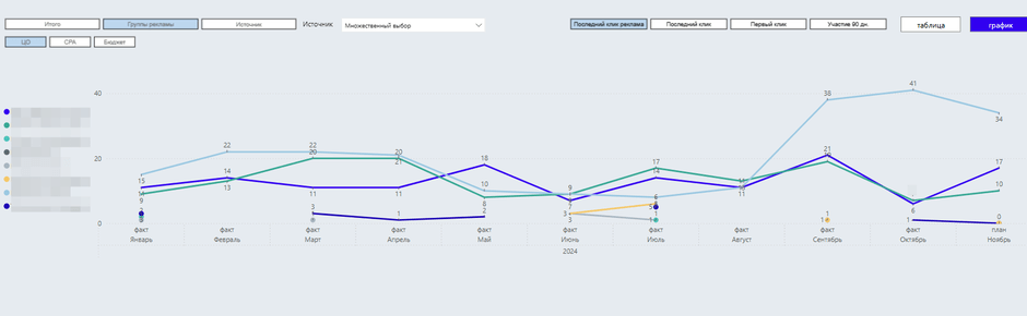 Отчет по эффективности рекламных каналов. Показывает динамику изменения целевых обращений в разрезе каналов